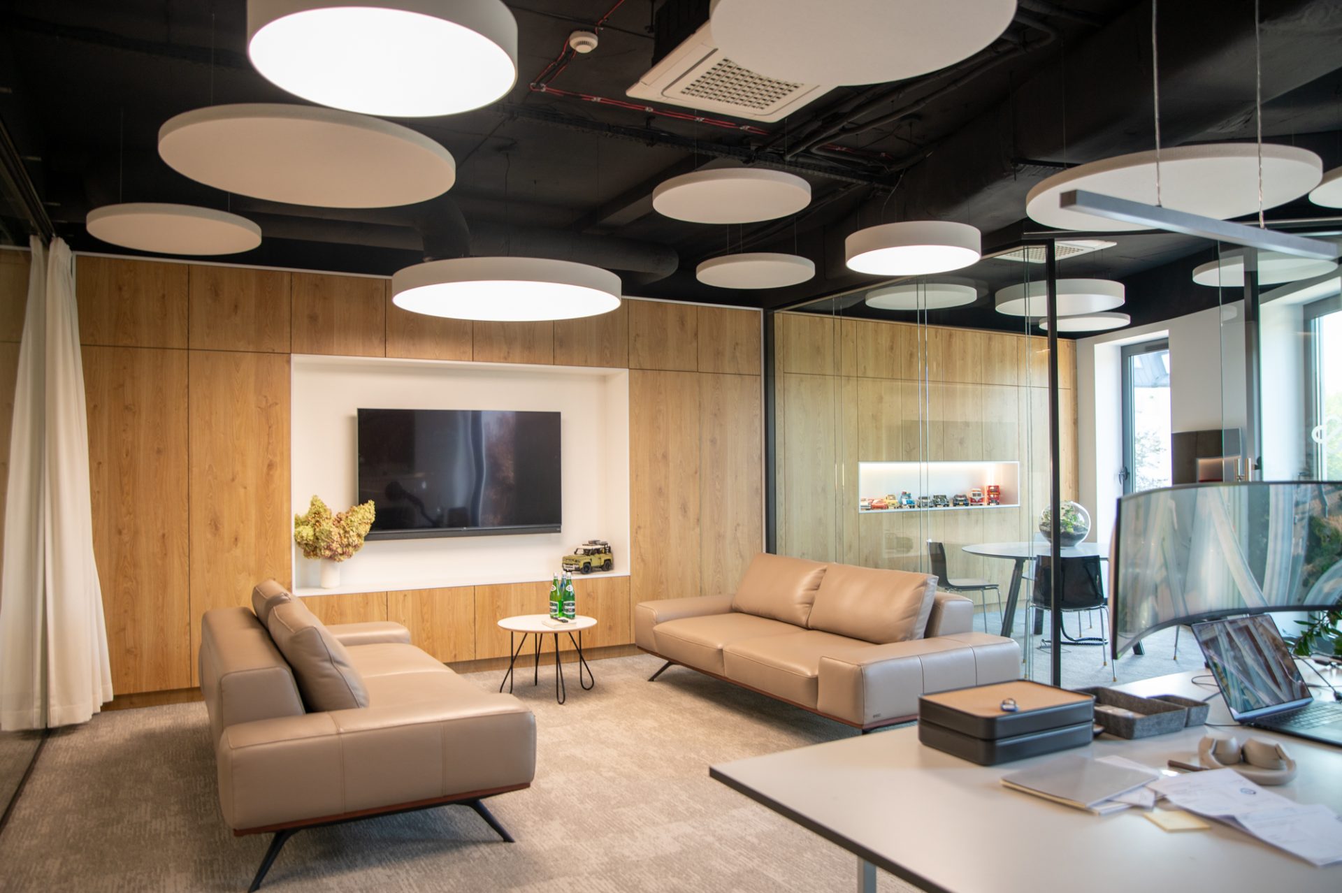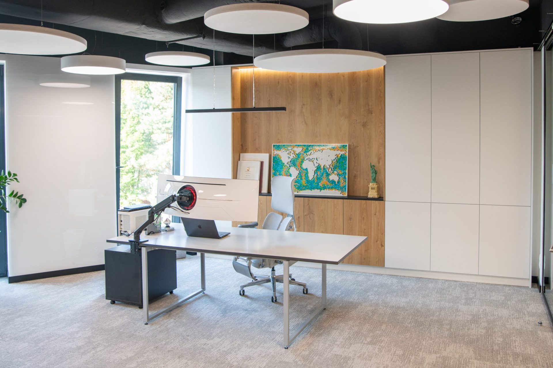 Z dumą prezentujemy efekt naszej realizacji dla renomowanej firmy z branży farmaceutycznej, w ramach której stworzyliśmy kompleksowe wyposażenie kluczowych przestrzeni biurowych – gabinetu prezesa, recepcji, sali konferencyjnej oraz pokoju relaksu dla pracowników. Z uwagi na rozmiar