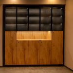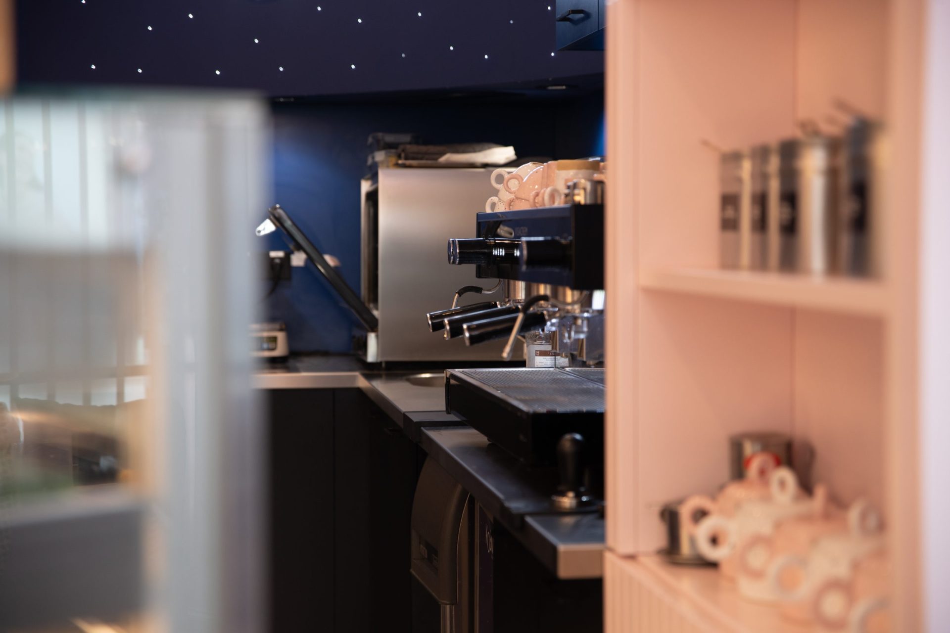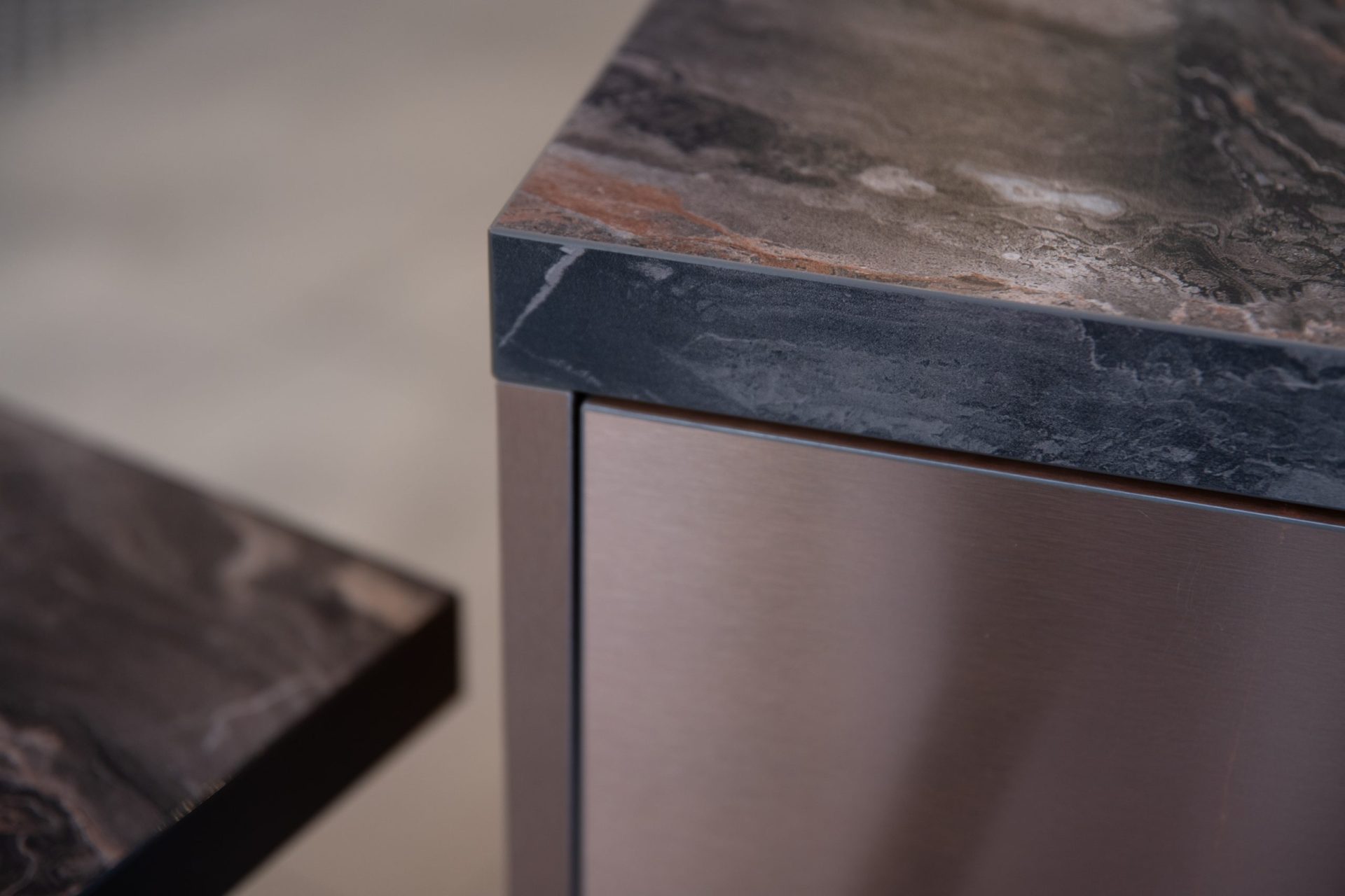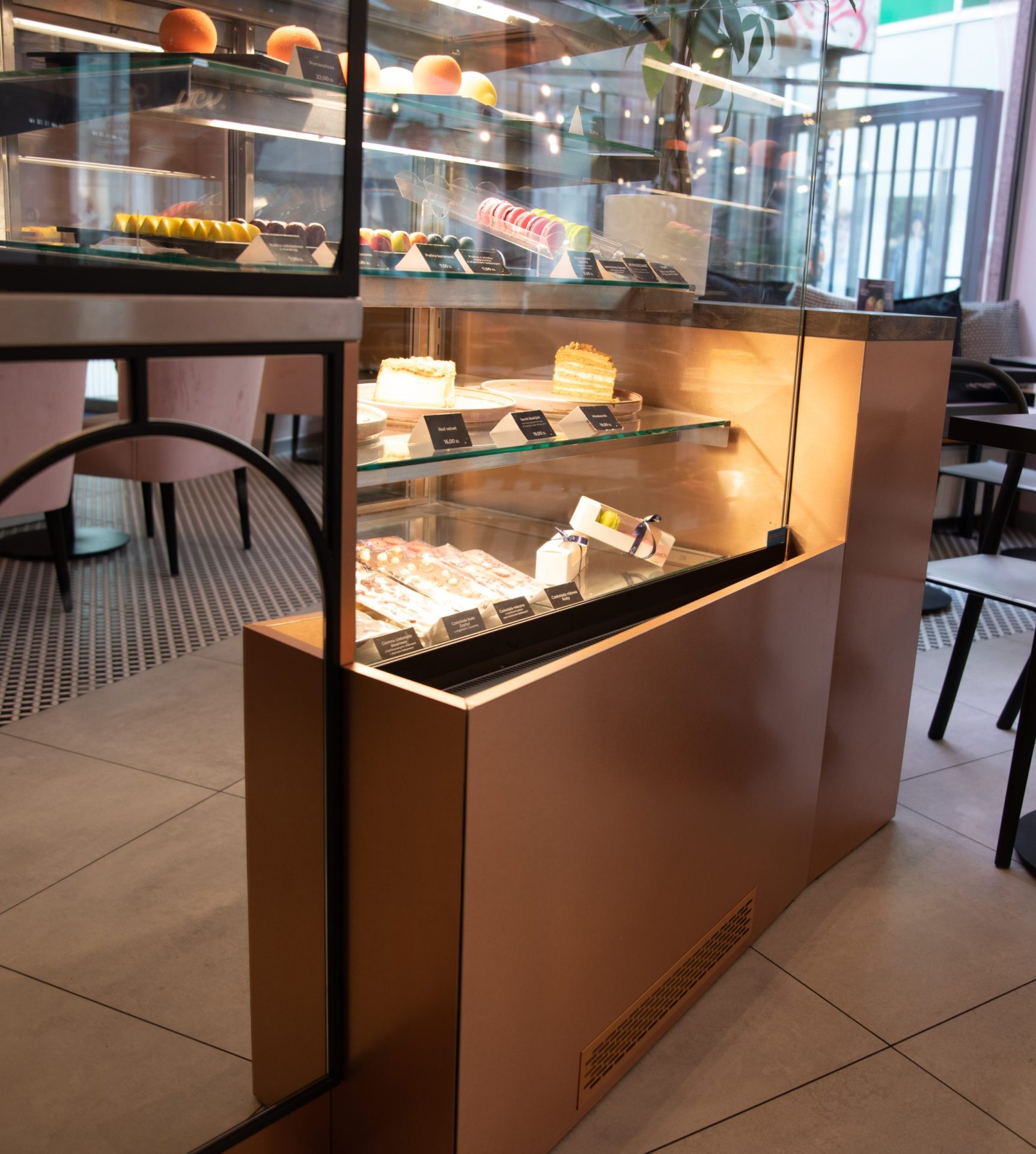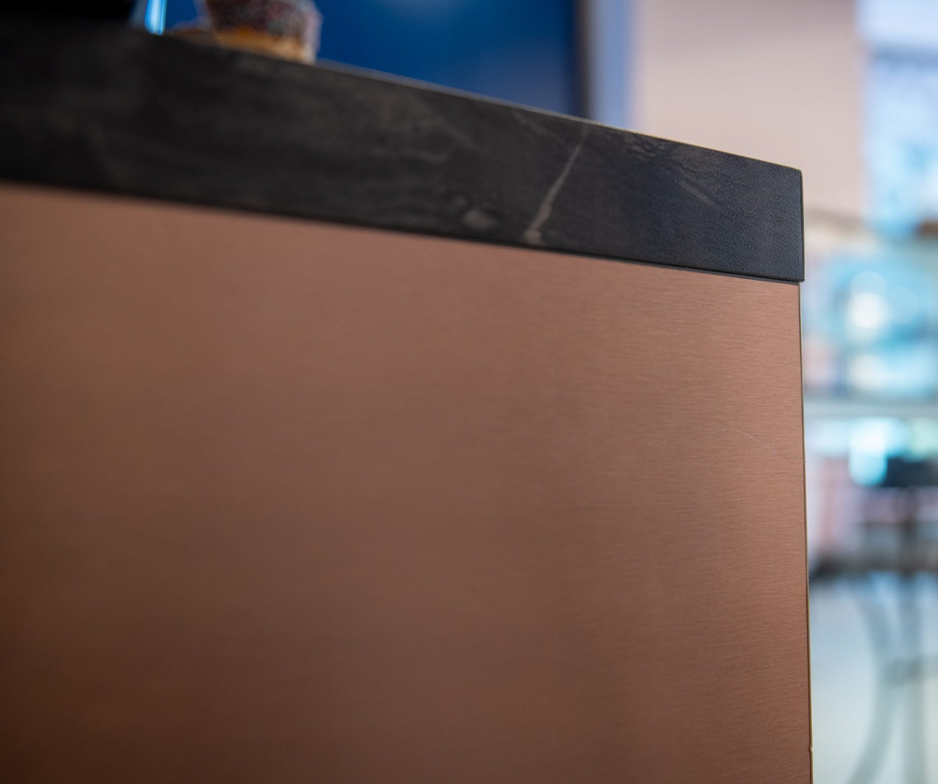 W centrum naszej instalacji znajduje się zabudowa główna, przeznaczona do obsługi klienta. Zewnętrzna część tej zabudowy została wykonana z laminatu metalizowanego w kolorze miedzi szczotkowanej, który nadaje jej nowoczesny i luksusowy charakter. Dodatkowego wyrafinowania dodaje panel, wykonany z frezowanego MDF-u w kolorze czarnego matu, wzbogacony wklejanymi lustrami. Wnętrze zabudowy od strony obsługi wykonane jest z czarnej płyty laminowanej oraz elementów z blachy nierdzewnej, co zapewnia trwałość i estetykę użytkowania.