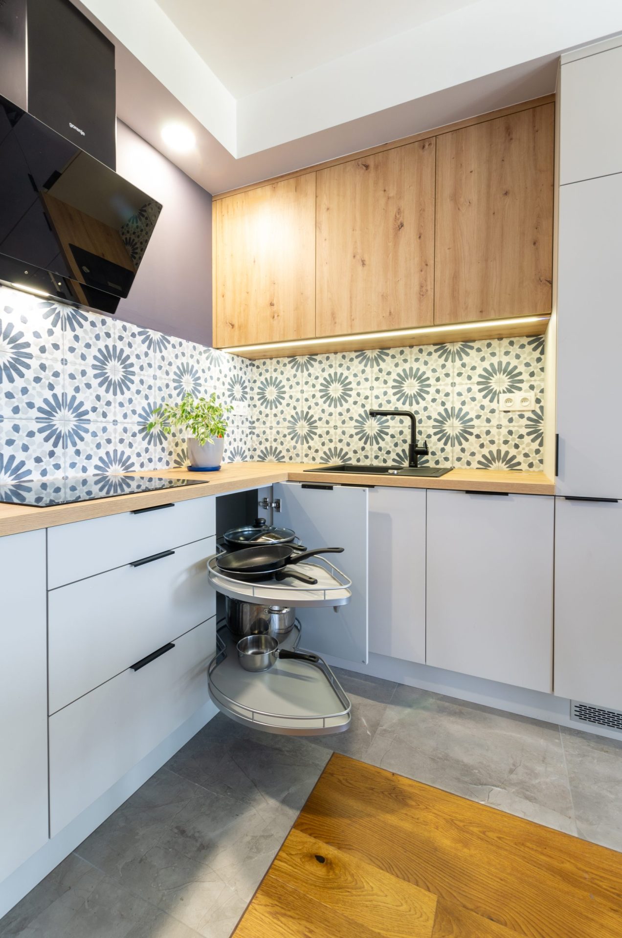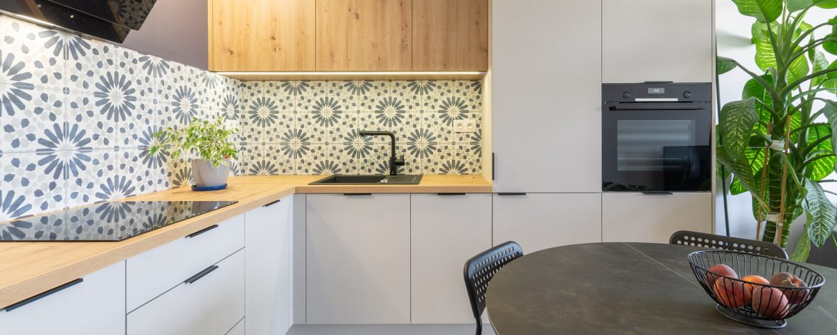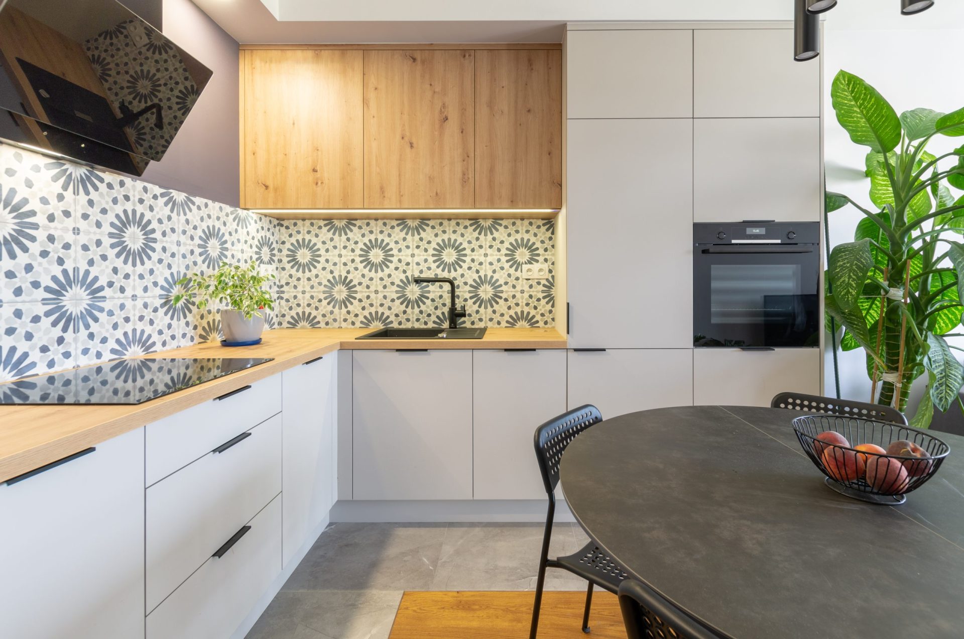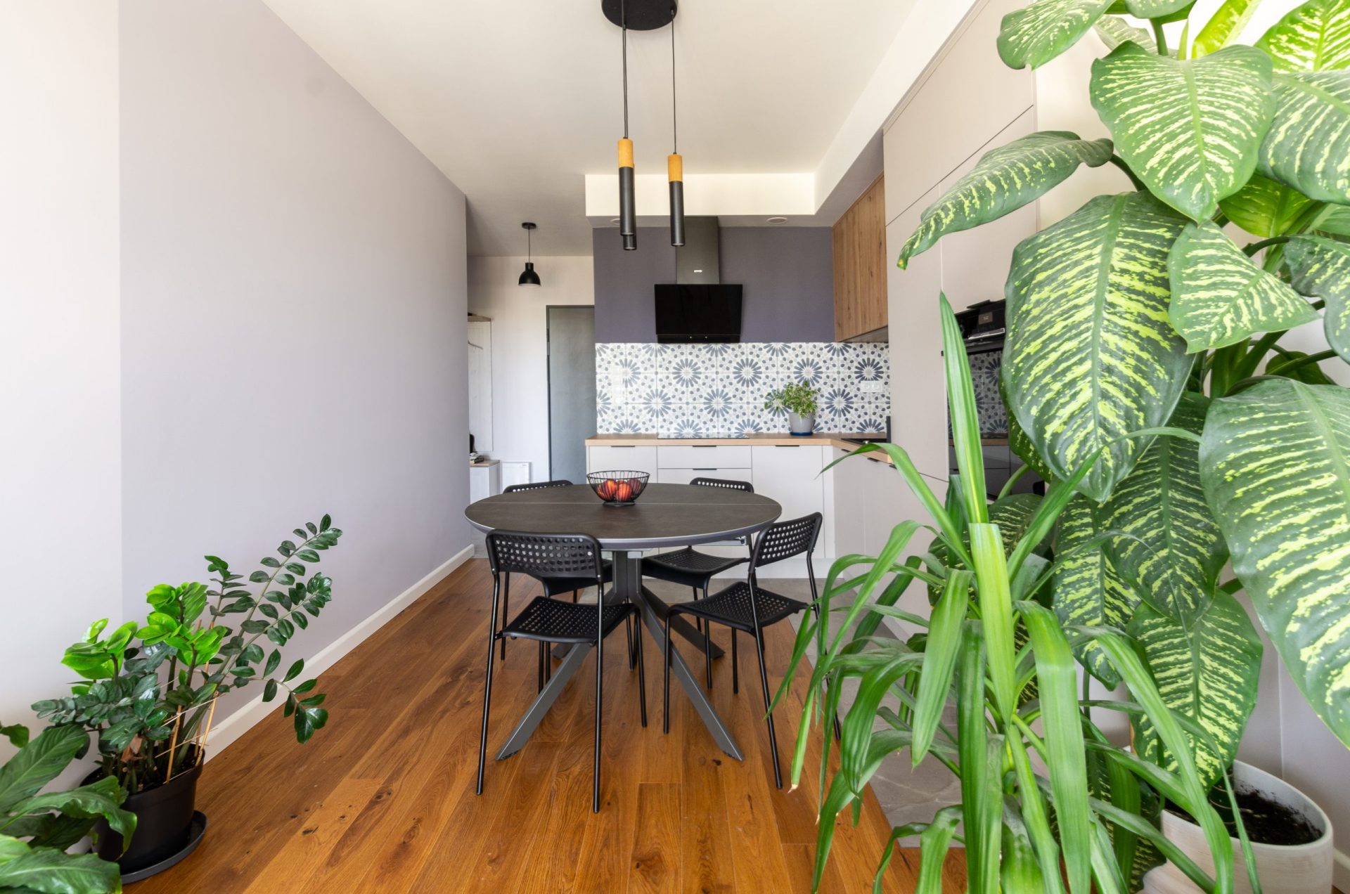 Kuchnia w mieszkaniu została zaprojektowana z myślą o stworzeniu przestrzeni przyjaznej i funkcjonalnej, a jednocześnie prostej w formie. Matowe fronty w kolorze jasnego popielu doskonale współgrają z laminowanymi płytami o naturalnym odcieniu dębu, nadając kuchni nowoczesnego i jednocześnie przytulnego wyglądu. Wyjątkowy charakter zabudowy podkreślają liczna roślinność, która dodaje dodatkowego kolorytu do całości obrazu.