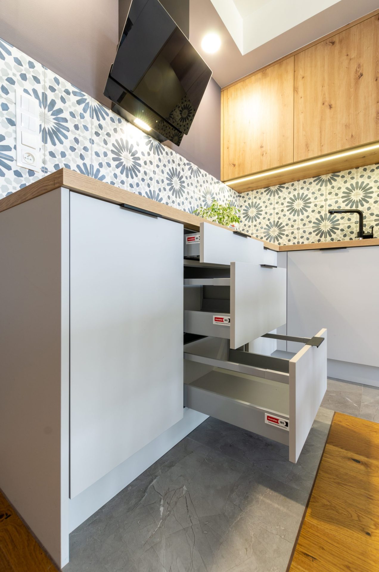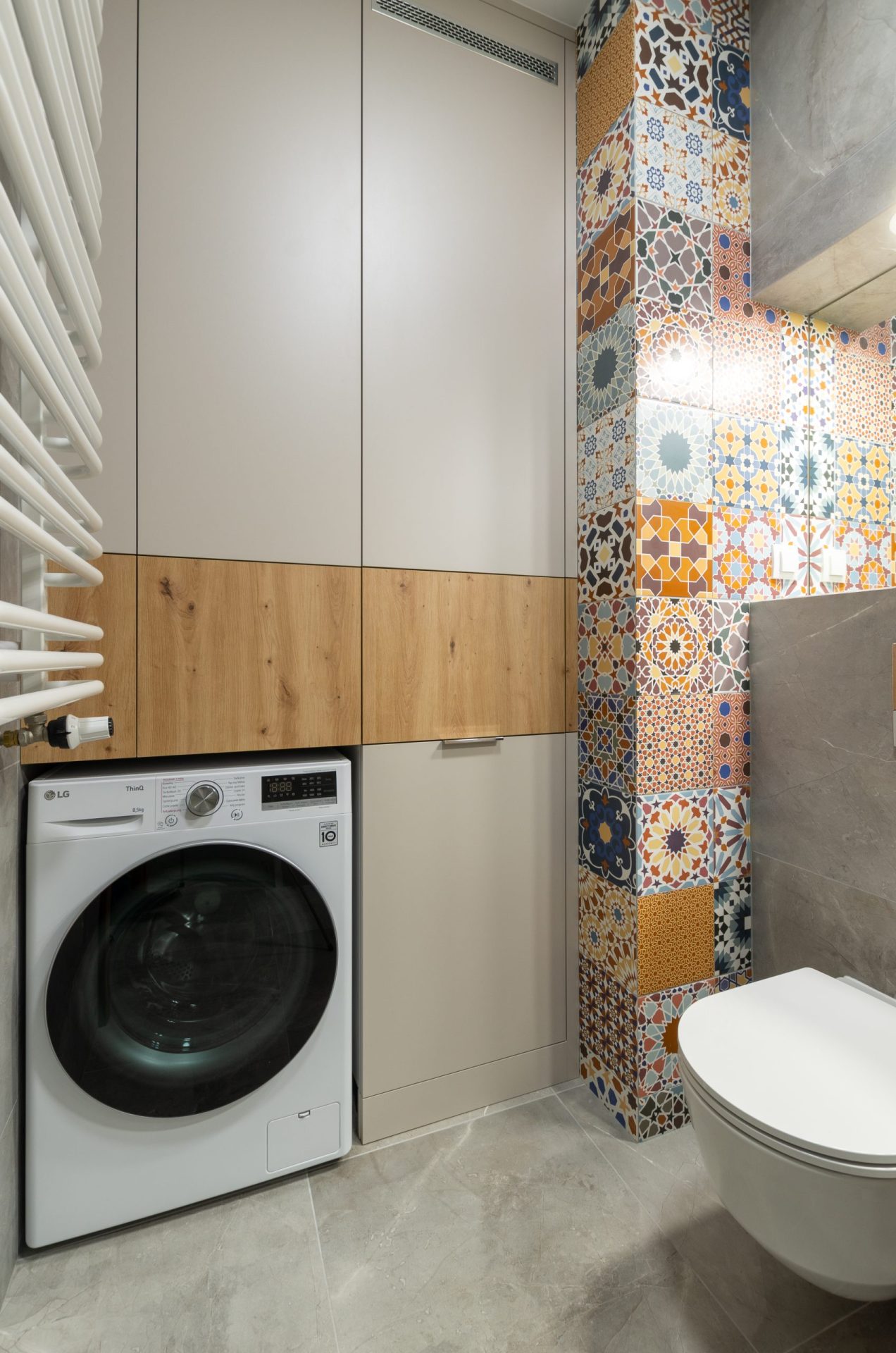 Zabudowa w łazience jest autorskim połączeniem stonowanych odcieni jasnego popielu oraz naturalnego dębu, w ten sposób uwypuklając kolorystyczne płytki w stylu hiszpańskim.