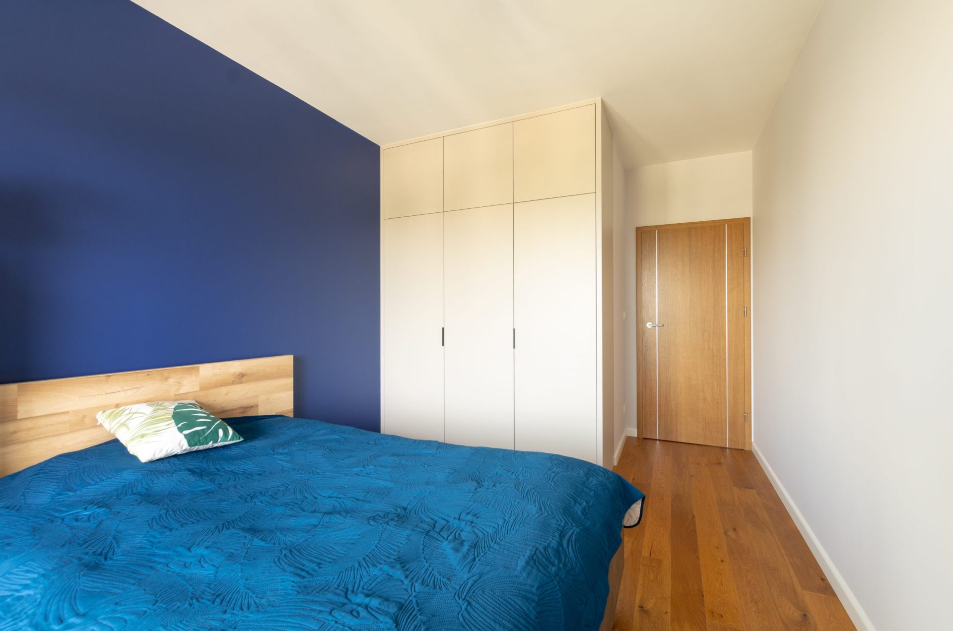 W części sypialnianej mieszkania zastosowano laminaty z kolorystyce kaszmiru. Ta kompozycja materiałów nadaje wnętrzu spokojny i przyjazny ton, podkreślając nowoczesny charakter przestrzeni, a jednocześnie wprowadzając przytulny, domowy klimat.