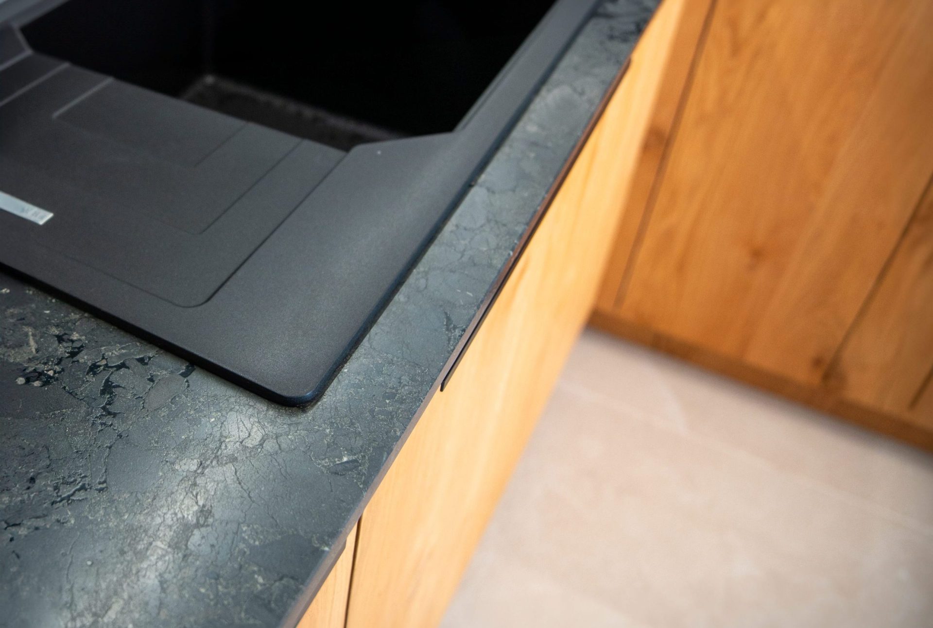 - Fronty szafek dolnych i półka narożna: fornir naturalny dąb sękaty, lakierowany mat