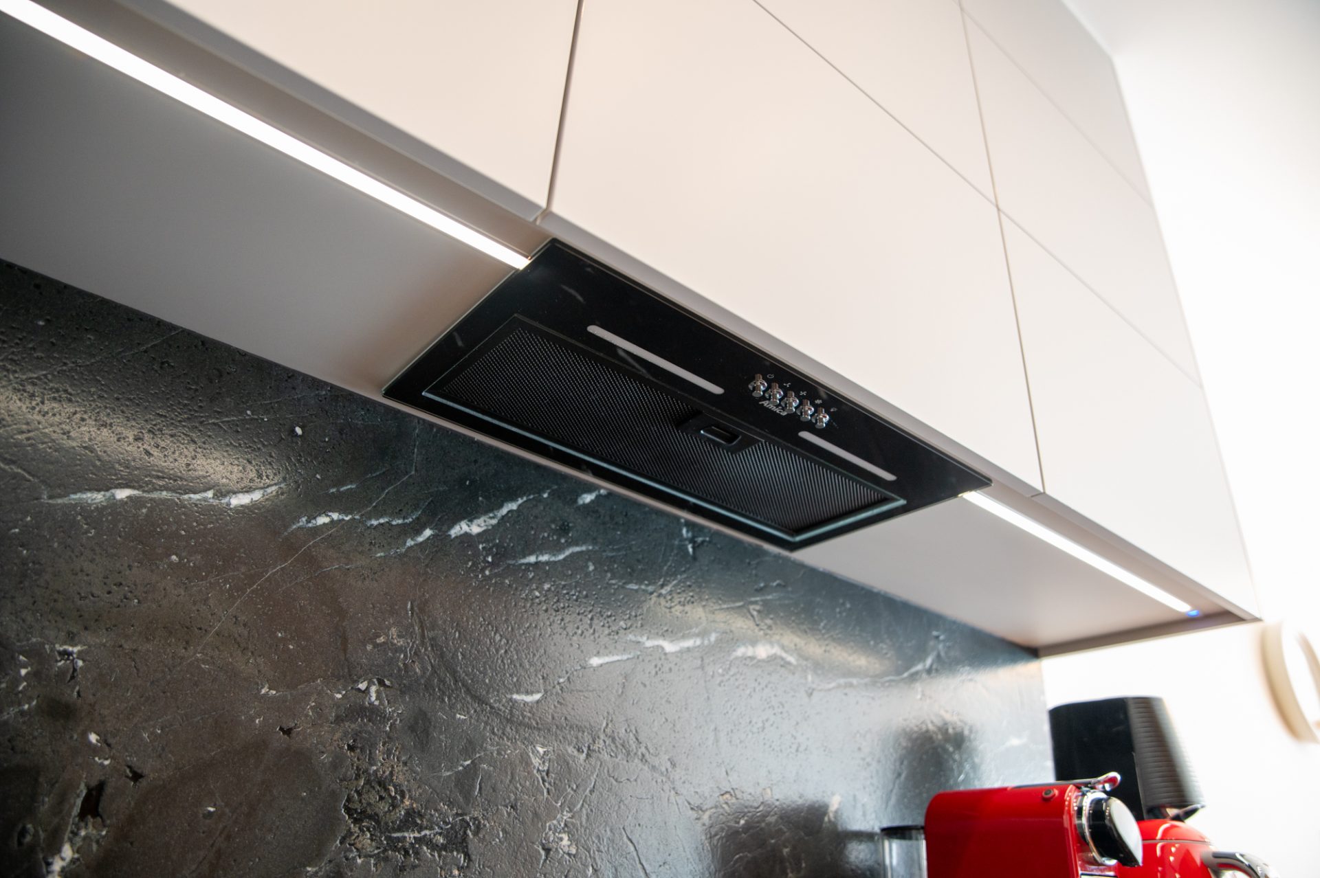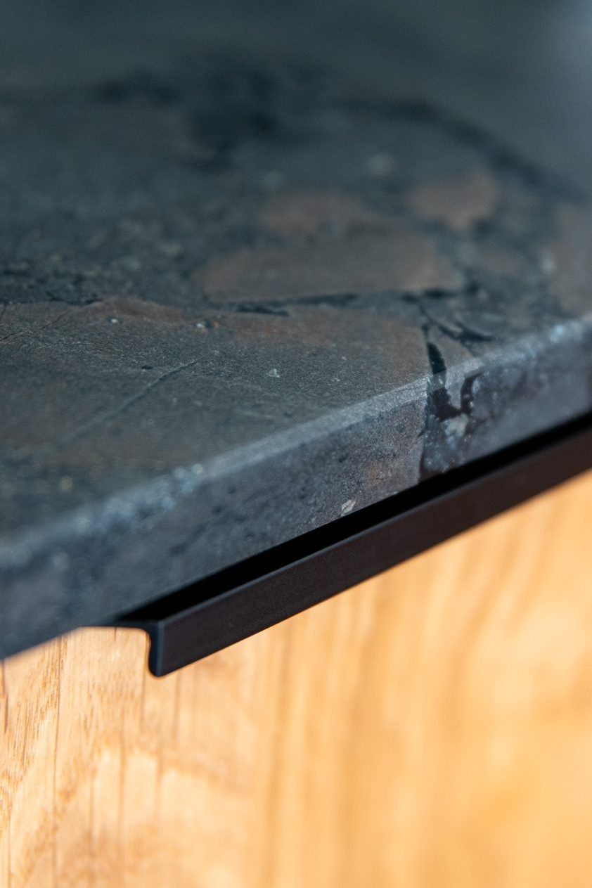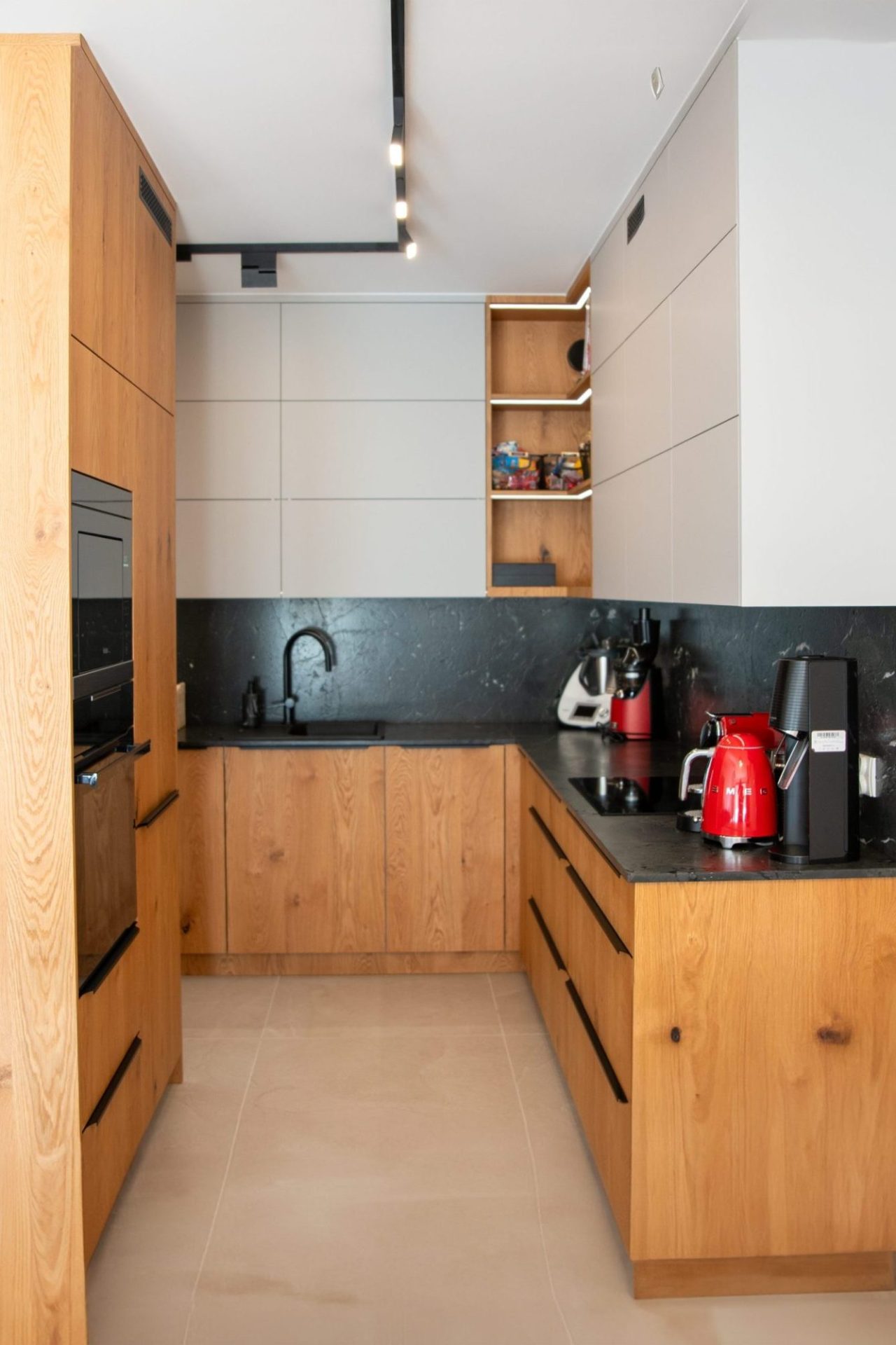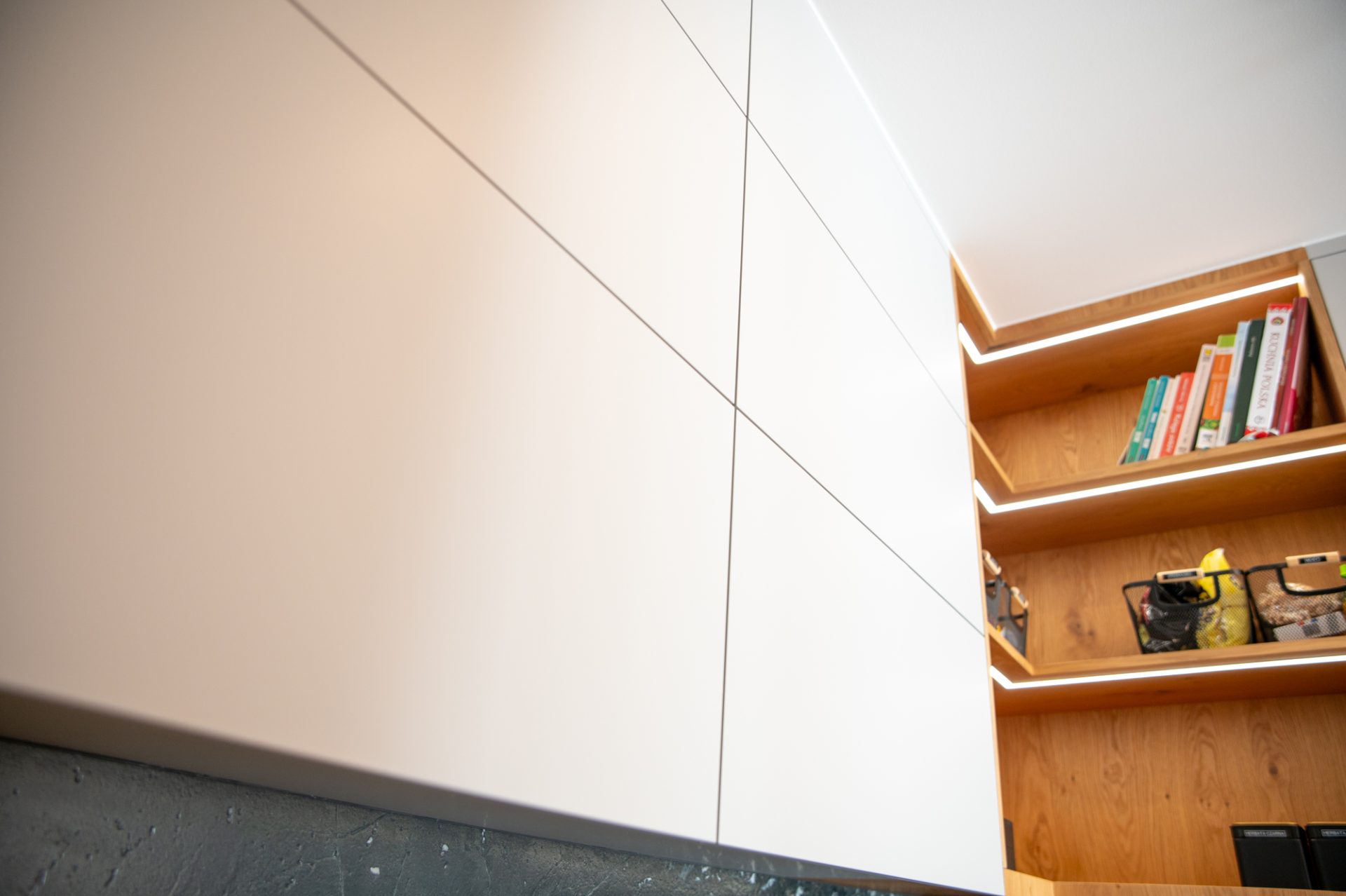 Zabudowa kuchenna łączy w sobie funkcjonalność i nowoczesny styl z subtelnym akcentem natury. Górne szafki wykończono w matowym, jasnoszarym akrylu, a dolne oraz narożną półkę wykonano z forniru dębu sękatego, lakierowanego w matowym wykończeniu. Czarne, krawędziowe uchwyty dodają całości elegancji, a subtelne kontrasty nadają kuchni świeży, stylowy wygląd. Blat i wysłona ścienna zostały wykonane na życzenie klienta, co pozwoliło na pełne dopasowanie zabudowy do indywidualnych potrzeb. Oświetlenie LED wkomponowane półki narożne dodaje nowoczesności i estetyczności, natomiast zamontowane pod szafkami wiszącymi spełnia praktyczną rolę w codziennym użytkowaniu.
