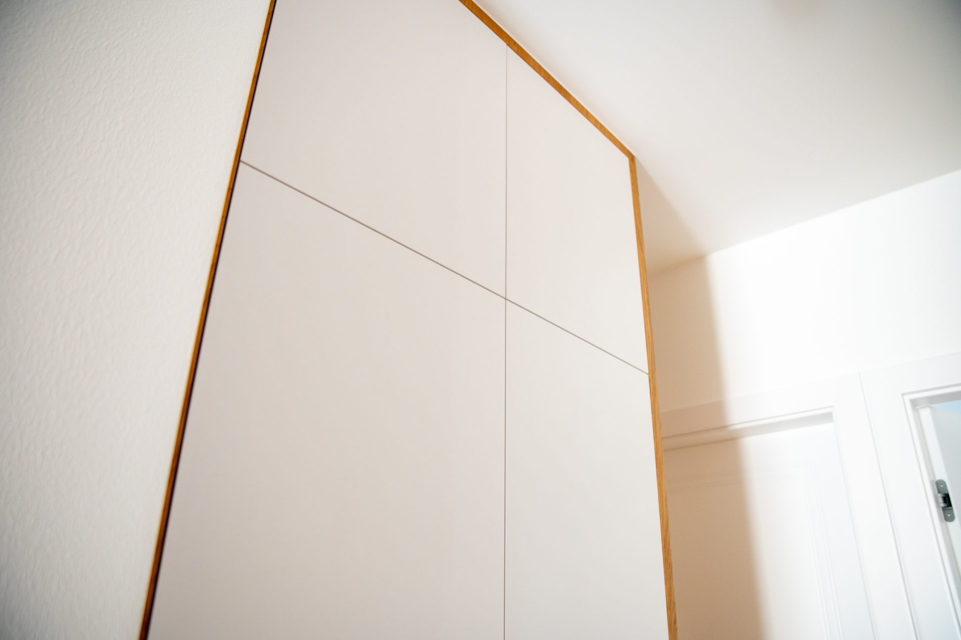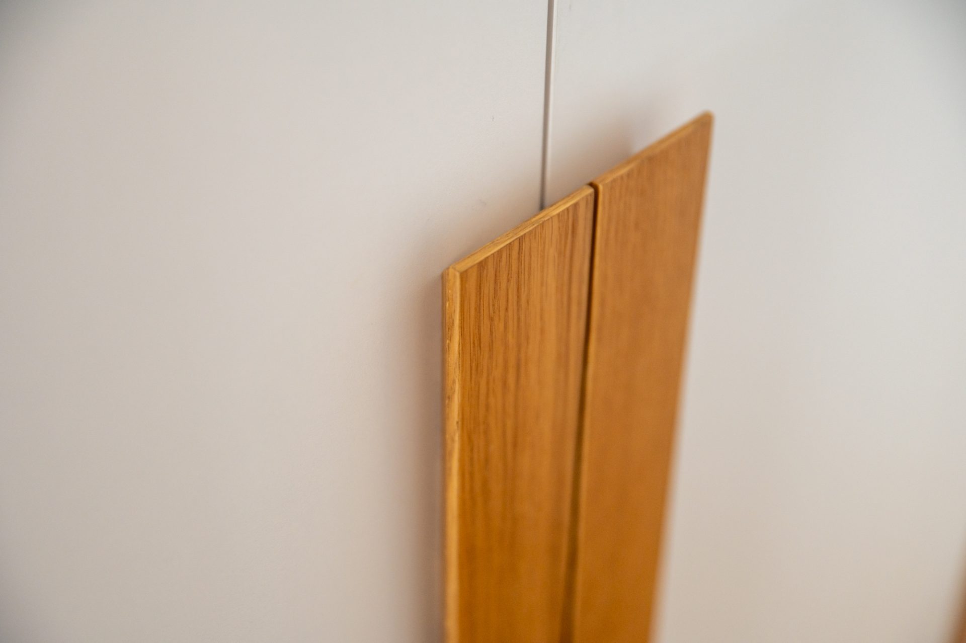 Szafa w przedpokoju to praktyczna, a jednocześnie efektowna zabudowa wykonana z laminatu w kolorze białym oraz forniru dębowego. Charakterystycznym elementem jest uchwyt zacięty pod kątem 45 stopni, który wykonano z tego samego forniru. To rozwiązanie dodaje wnętrzu nowoczesności, a jednocześnie podkreśla naturalne piękno drewna.