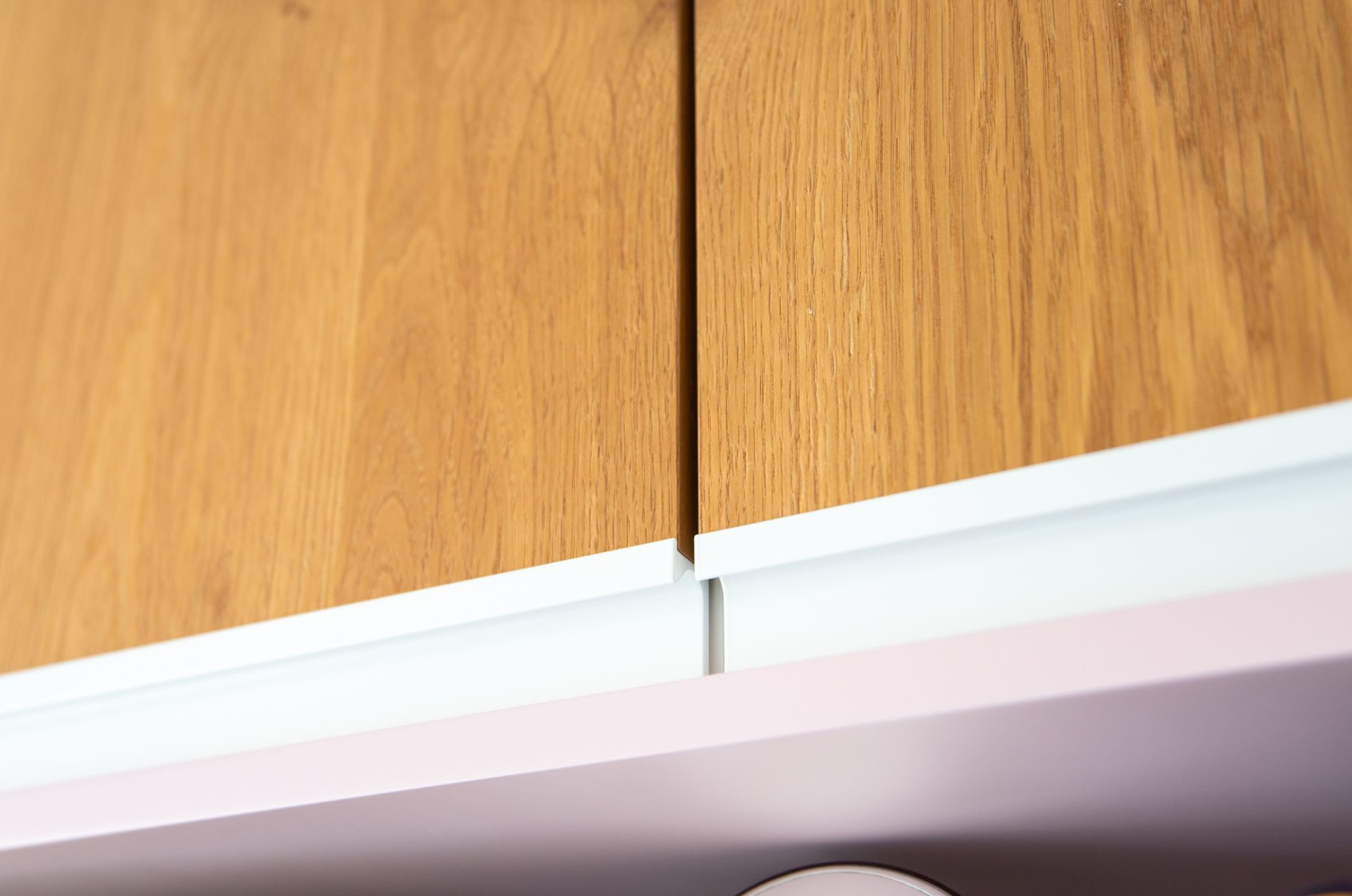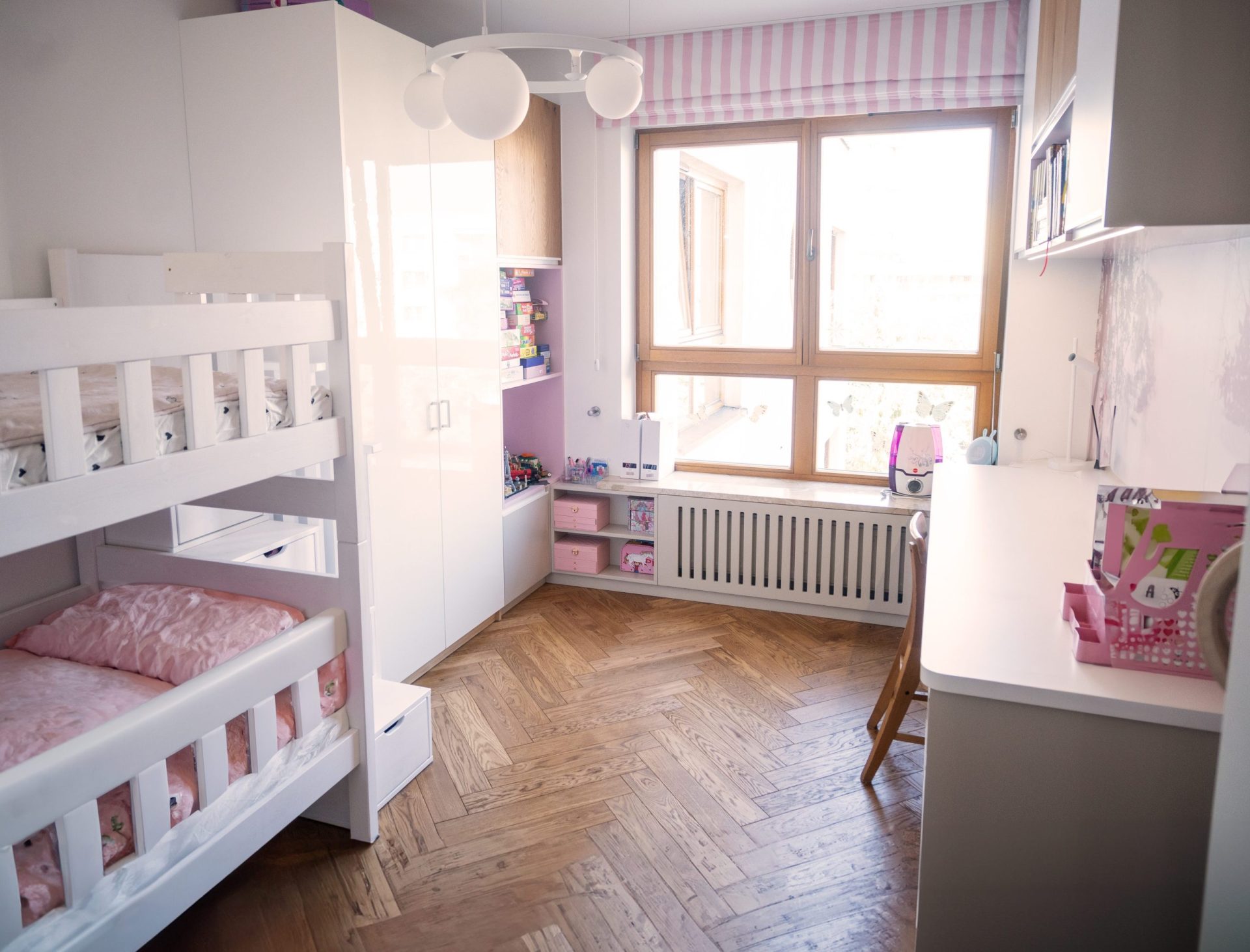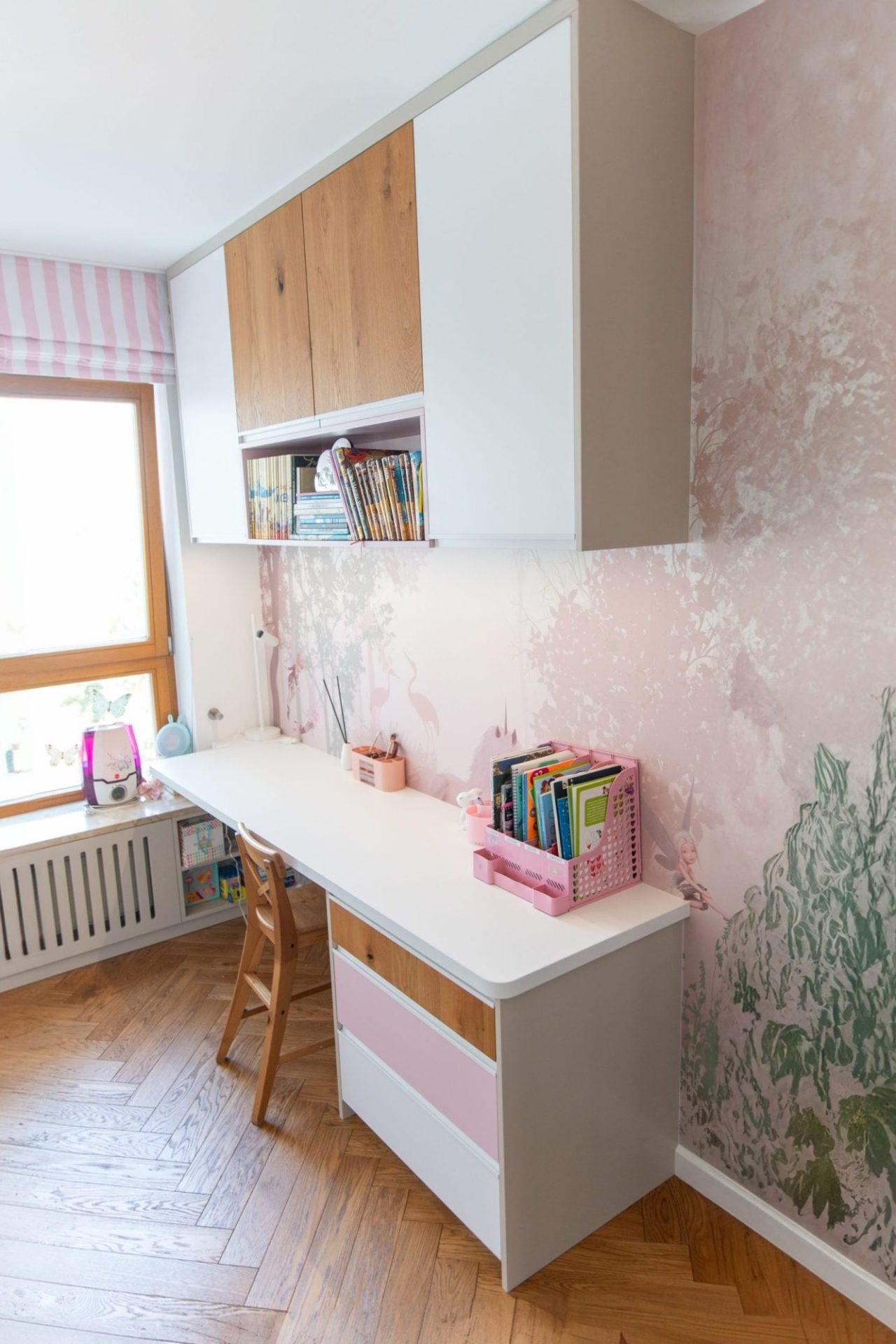 W pokoju dziecięcym zastosowano laminowaną płytę oraz naturalny fornir, aby uzyskać estetyczny i jednocześnie funkcjonalny efekt. Przestronna zabudowa obejmuje szafki nad biurkiem, przestrzeń ukrywającą grzejnik pod parapetem oraz wysoką szafkę z półkami, która łączy praktyczność z estetycznym wykończeniem. Laminowane płyty w białym kolorze połączono z akcentami dębowymi oraz lakierowaną płytą MDF w dwóch kolorach w głębokim macie, które nadają przestrzeni subtelne i przyjazne akcenty kolorystyczne. Zastosowanie powierzchni matowych znacząco ułatwia utrzymanie estetyki pomieszczenia przy najbardziej wymagającym użytkownikach jakimi są dzieci :) Całości dopełnia oświetlenie LED komponowane w szafki nad biurkiem, dzięki czemu zyskaliśmy subtelne oświetlenie przestrzeni roboczej biurka.
