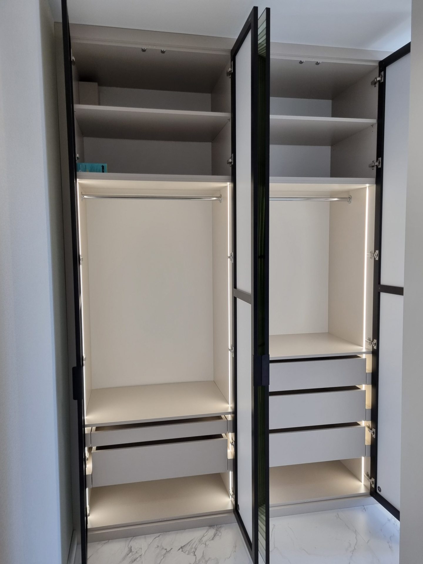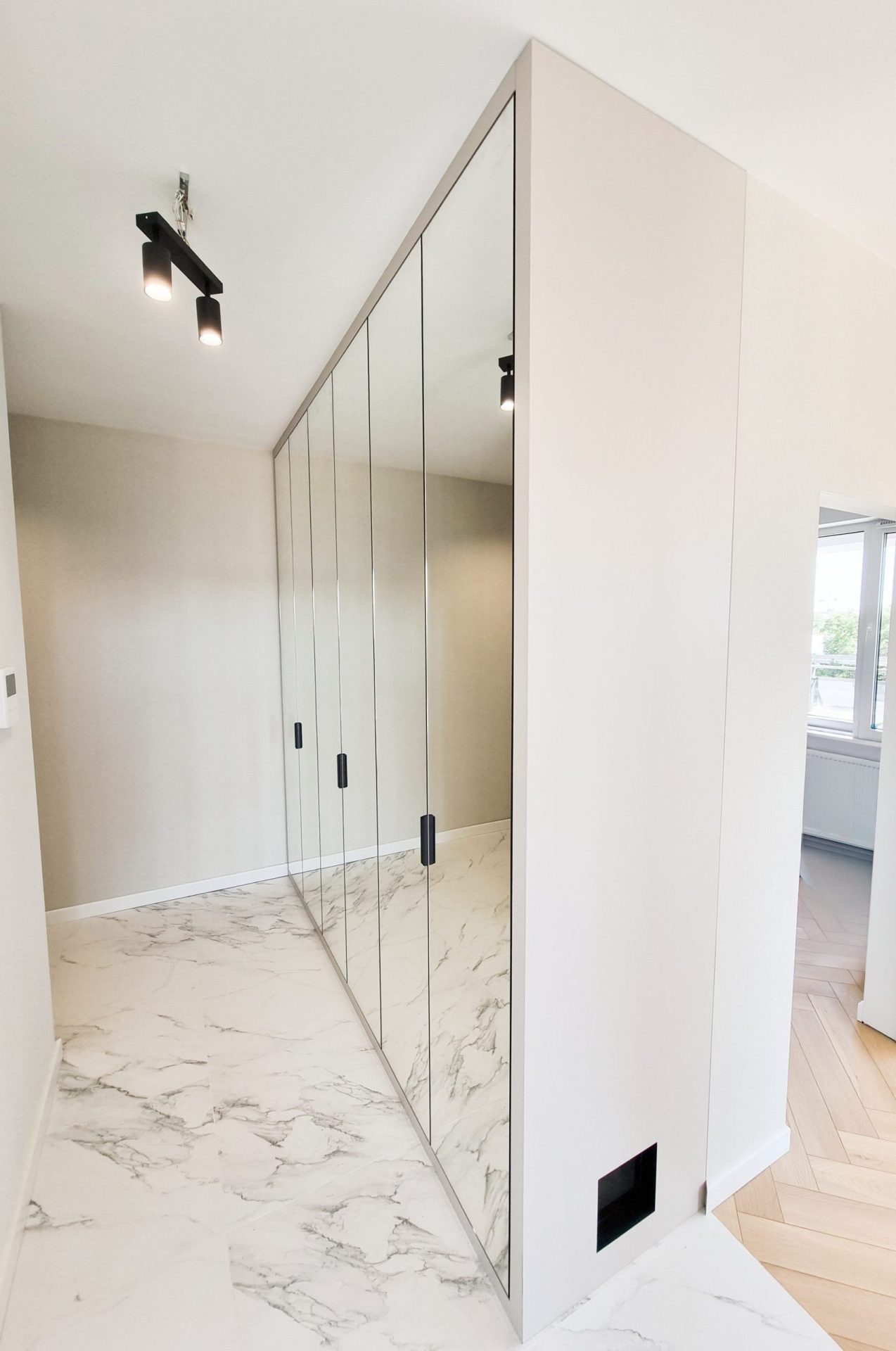 Kolejna zabudowa z lustrem w przedpokoju to praktyczne i stylowe rozwiązanie, które optycznie powiększa przestrzeń. Fronty zostały wykonane ze srebrnego lustra zabezpieczonego folią bezpieczną, w subtelnej ramie w kolorze czarnego matu. Szuflady Blum Movento oraz oświetlenie LED z czujnikiem ruchu sprawiają, że wnętrze szafy jest wygodne i dobrze zorganizowane. Na specjalne życzenie klienta w boku szafy zamontowano wejście do kociej kuwety, co sprawia, że przestrzeń jest przyjazna również dla zwierząt.