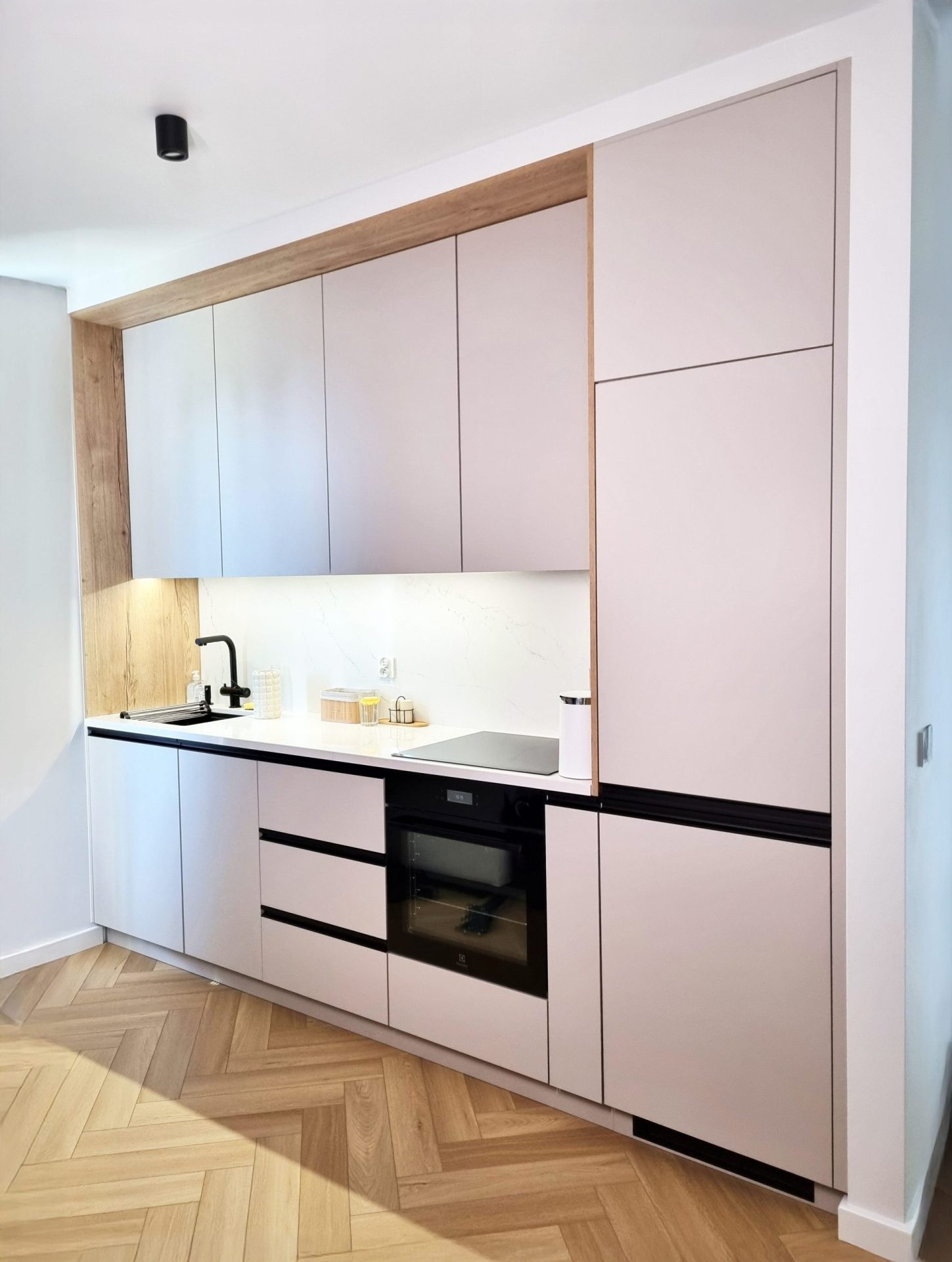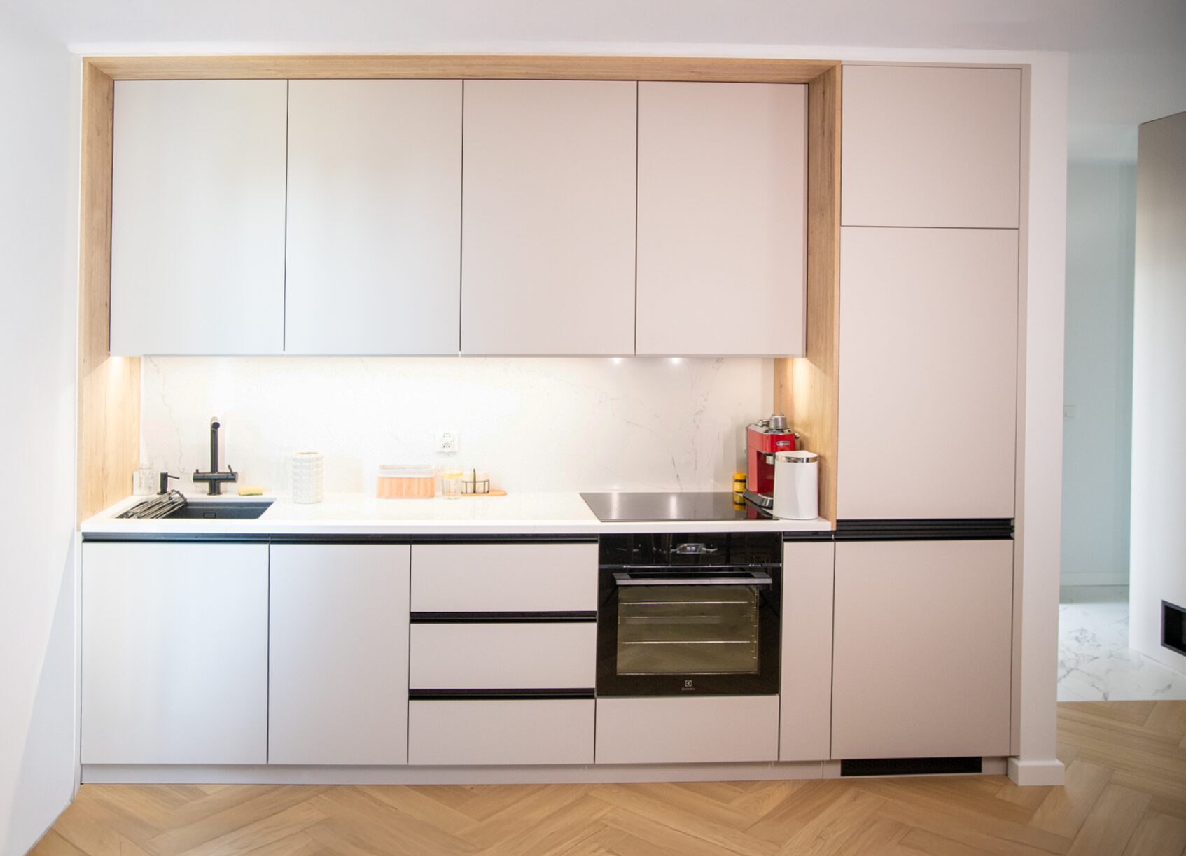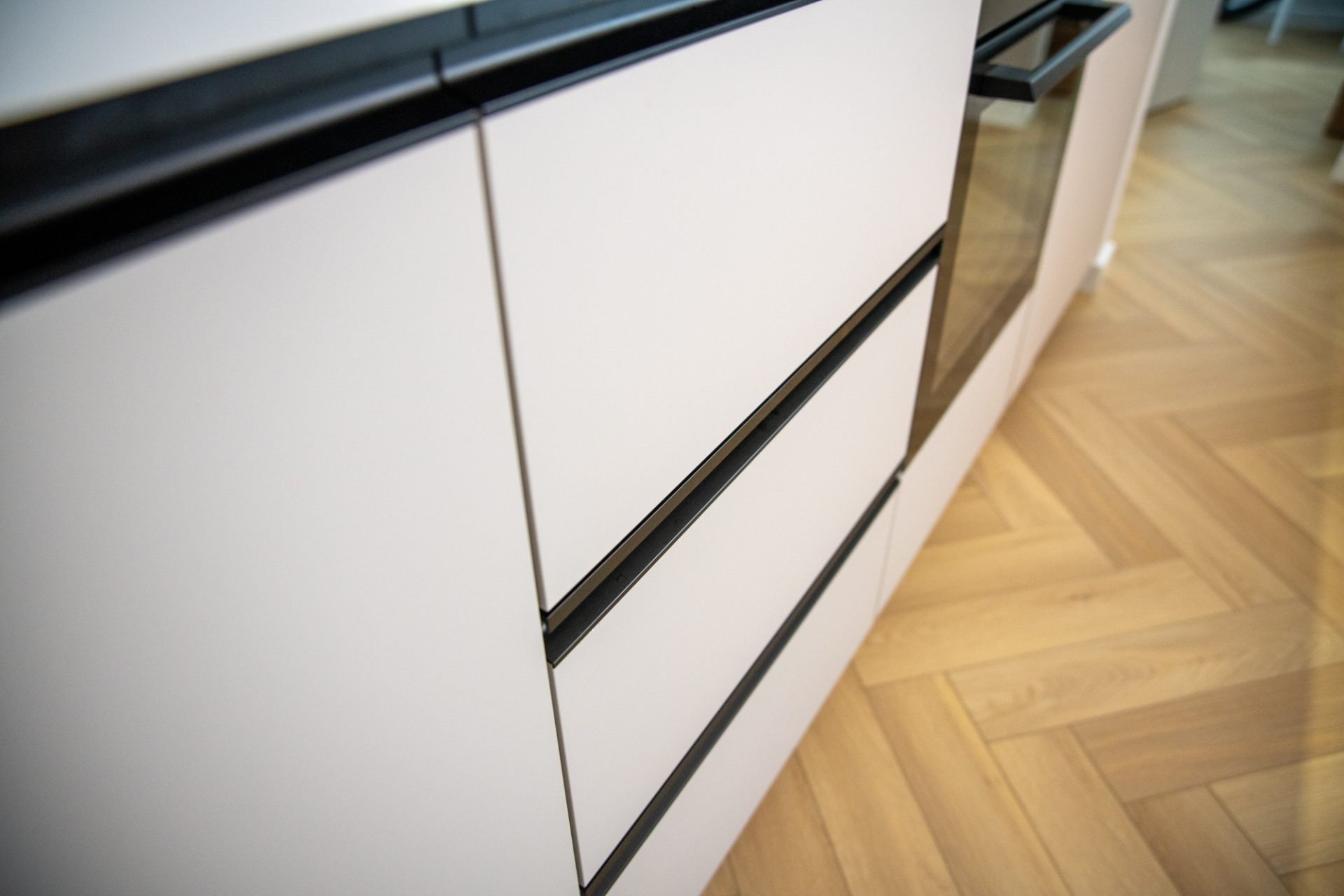 Kuchnia w mieszkaniu została zaprojektowana z myślą o estetycznej prostocie i wygodzie użytkowania. Jasnoszare, matowe fronty o powłoce, która zapobiega pozostawianiu odcisków palców, doskonale komponują się z ramą w kolorze naturalnego dębu. Na specjalne życzenie klienta blaty zamontowano na niestandardowej wysokości 97 cm, co pozwoliło zyskać dodatkową przestrzeń dzięki szufladom umieszczonym nad zmywarką oraz pod lodówką. Kuchnia jest minimalistyczna, a zarazem funkcjonalna – wysokiej jakości uchwyty i ukryte szuflady dodają wnętrzu elegancji.