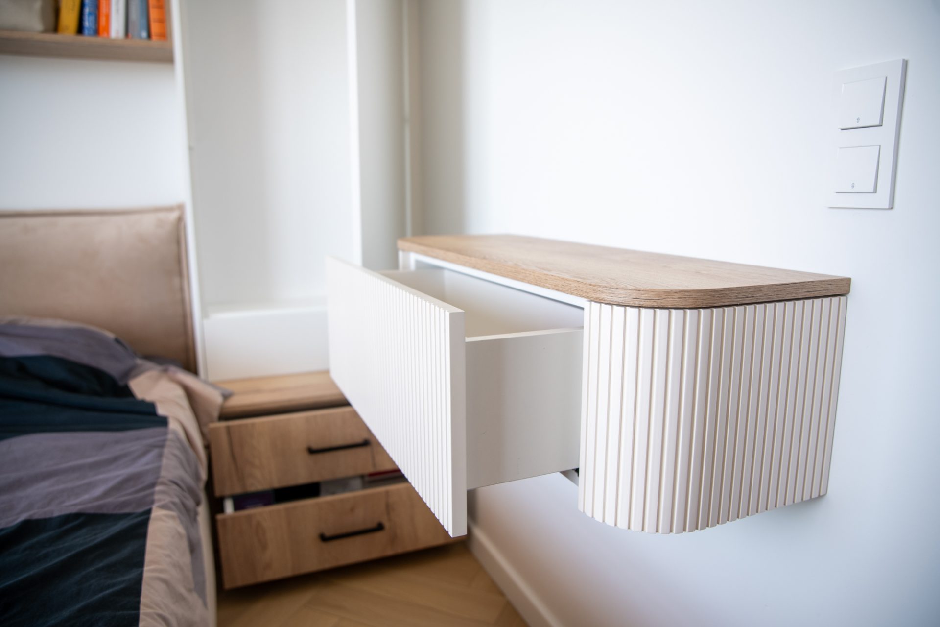 Sypialnia została wyposażona w nowoczesną zabudowę z białymi, matowymi frontami otwieranymi systemem Blum Tip-On. Połączenie białej płyty laminowanej z dębowymi akcentami wprowadza do wnętrza harmonię i ciepło. Szczególnym elementem sypialni jest elegancka, ręczenie wykonana wisząca toaletka z charakterystycznym ryflowaniem, które dodaje całości wyjątkowego wyrazu. W zabudowie zastosowano oświetlenie LED o neutralnej barwie oraz ściemniacz sterowany z pilota, co umożliwia dopasowanie światła do nastroju.
