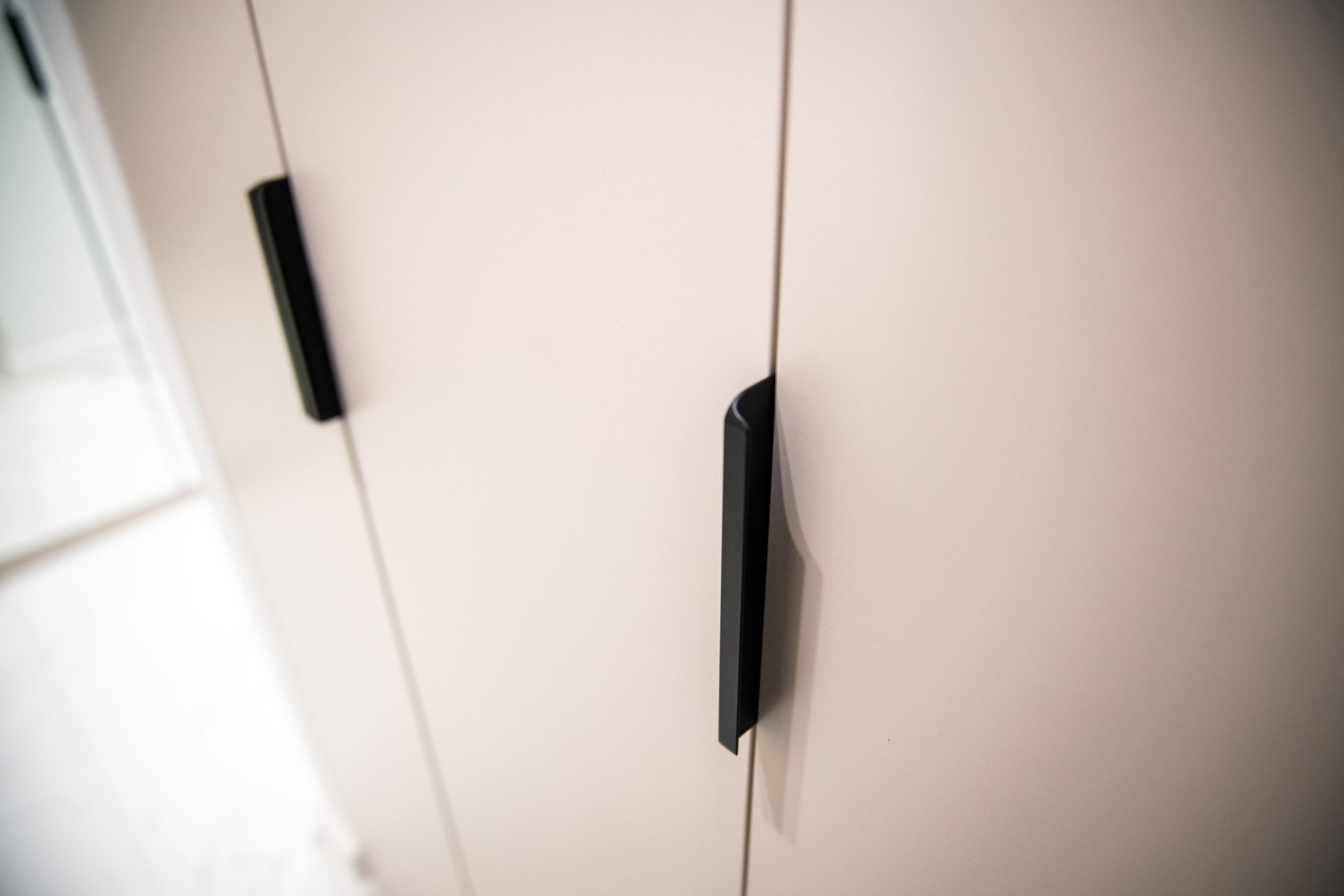 W przedpokoju umieszczono szafę z wygodnym siedziskiem, które wprowadza do wnętrza ciepły akcent w odcieniach naturalnego dębu. Fronty w eleganckim kolorze kaszmiru oraz czarne matowe uchwyty podkreślają nowoczesny charakter tego elementu, a przemyślane rozwiązania, takie jak przeniesienie włącznika światła na bok mebla, zwiększają funkcjonalność.