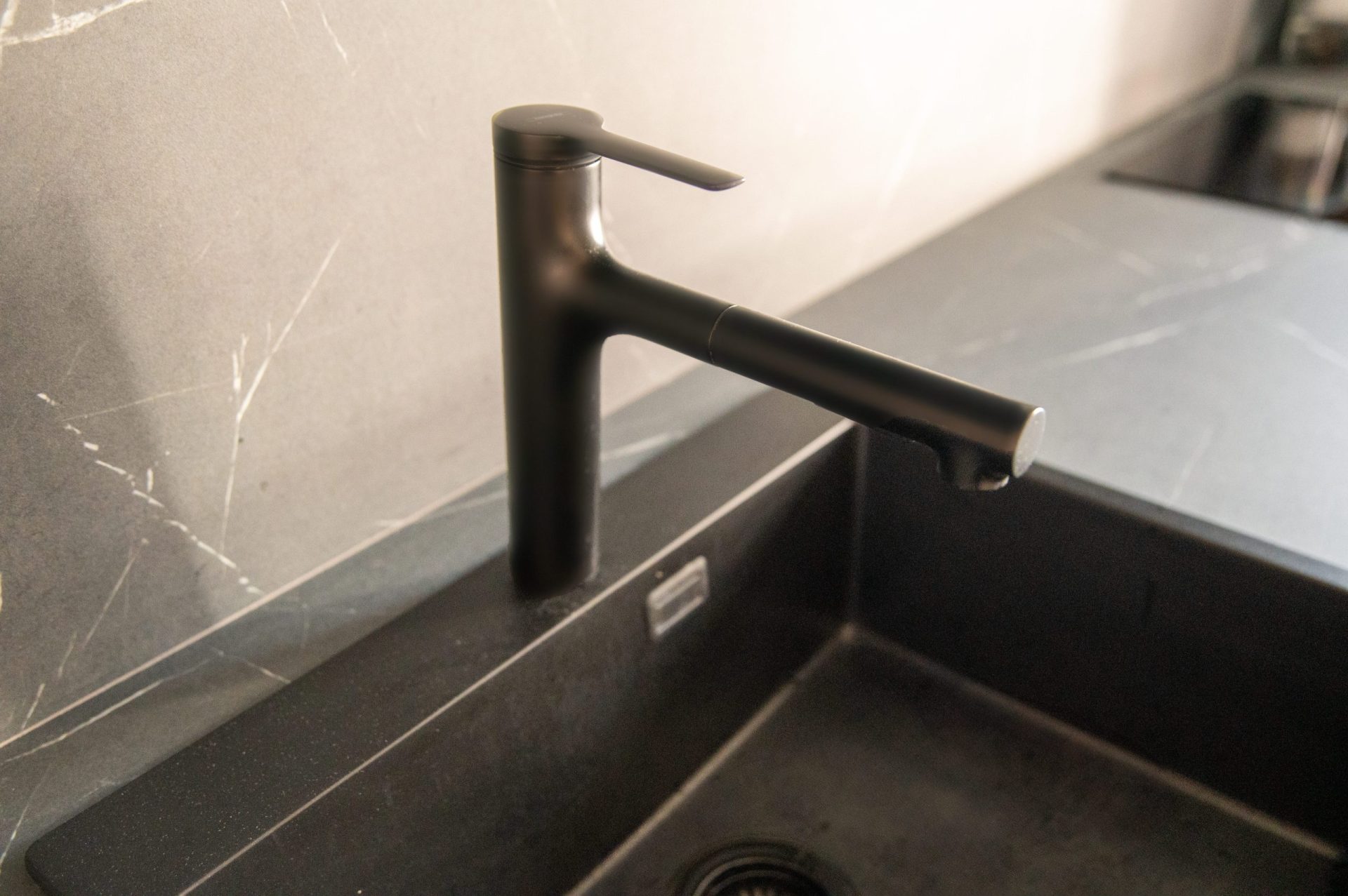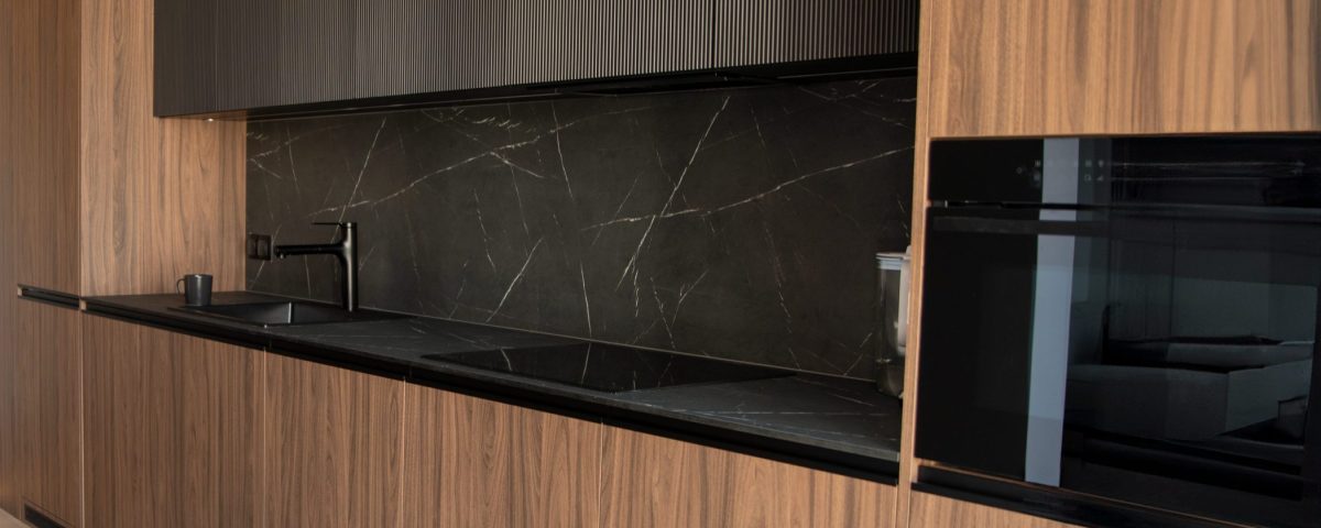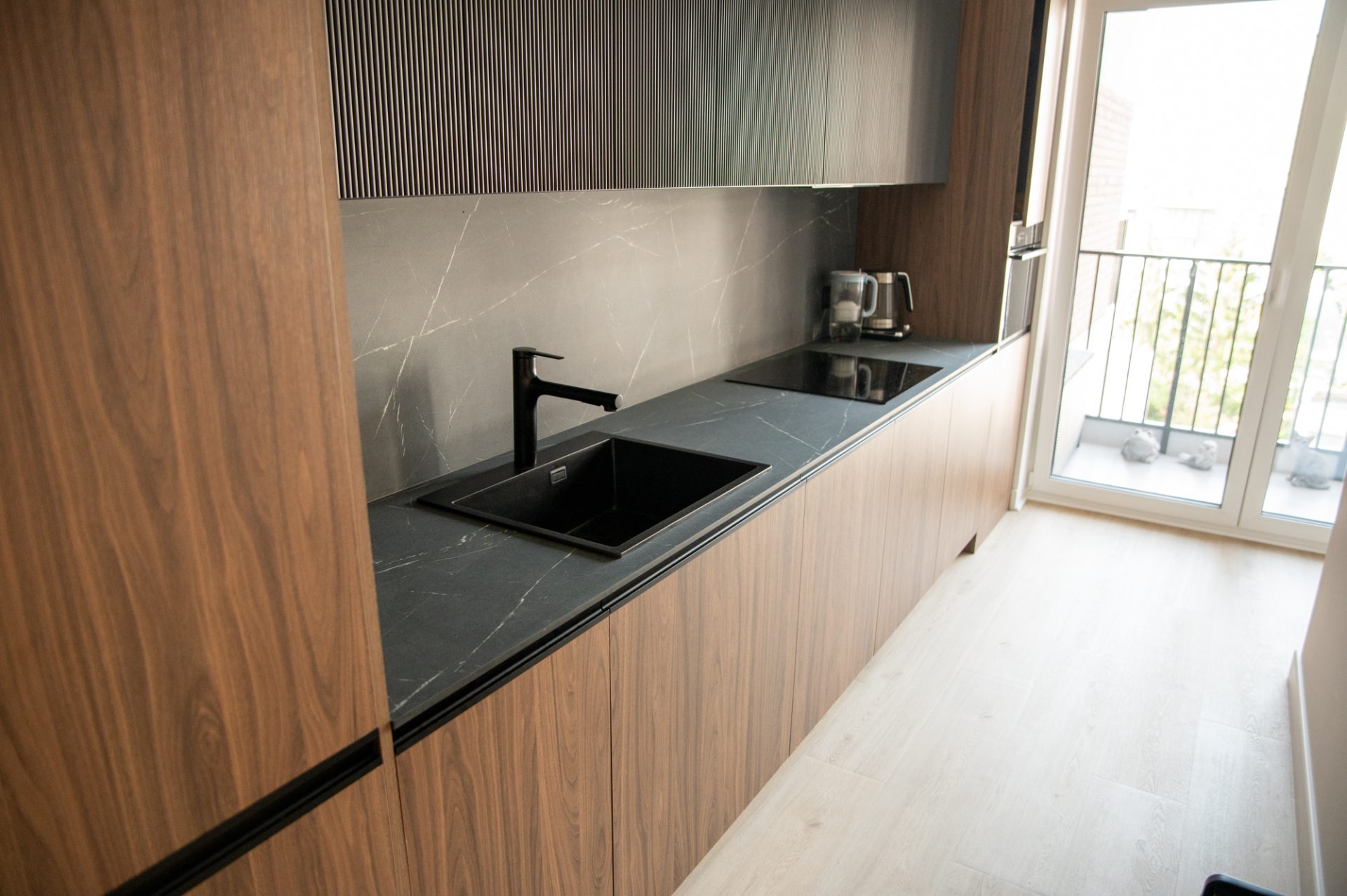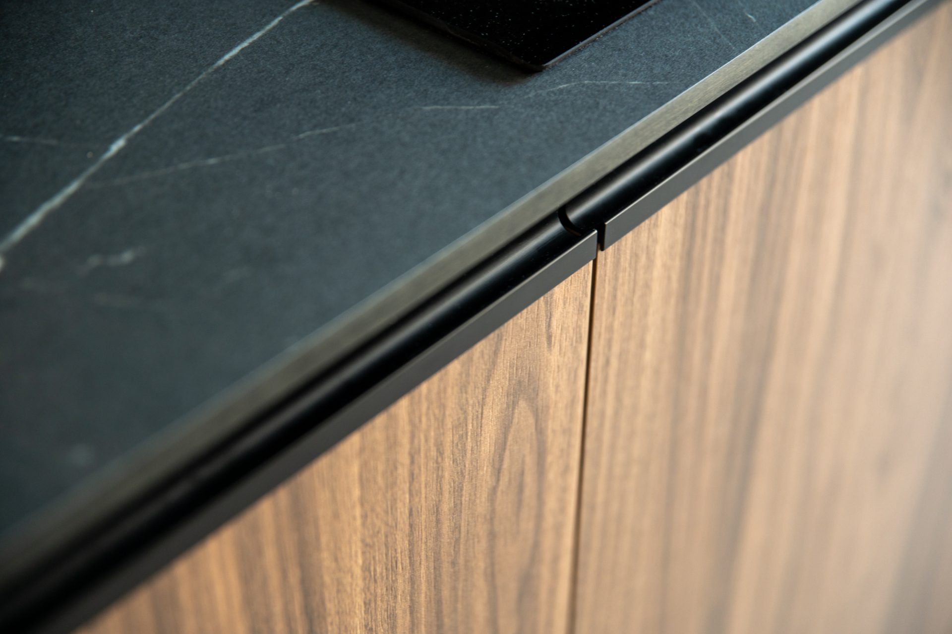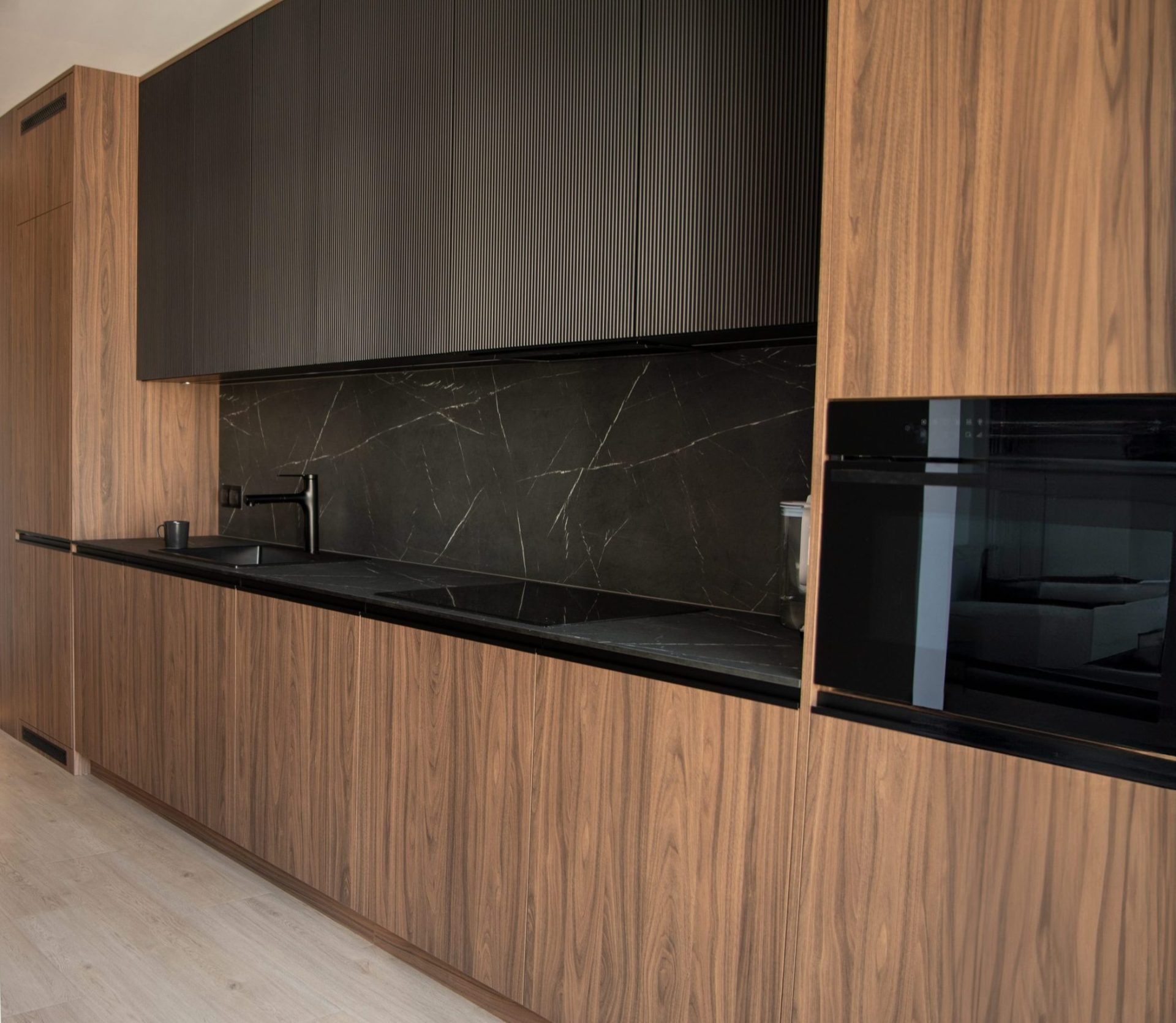 Kuchnia została wyposażona w eleganckie fronty z laminatu w naturalnym odcieniu orzecha (Egger H3710 ST12 Orzech Carini) oraz lakierowany na czarno matowy MDF z ryflowanym wzorem, co nadaje wnętrzu nowoczesny charakter. Praktyczne uchwyty krawędziowe w dolnych szafkach (UKW-5 Zobal) i blat o wyglądzie marmuru (GetaLit MA112 Meduno) tworzą harmonijną i funkcjonalną przestrzeń.