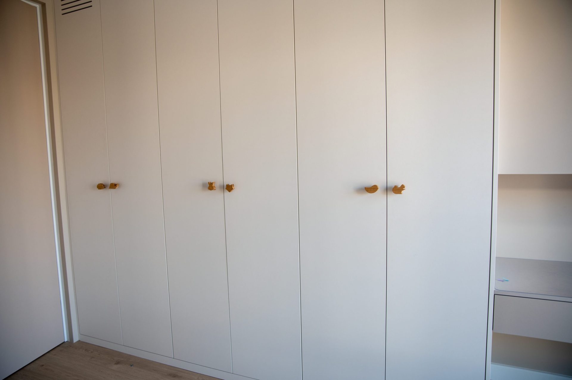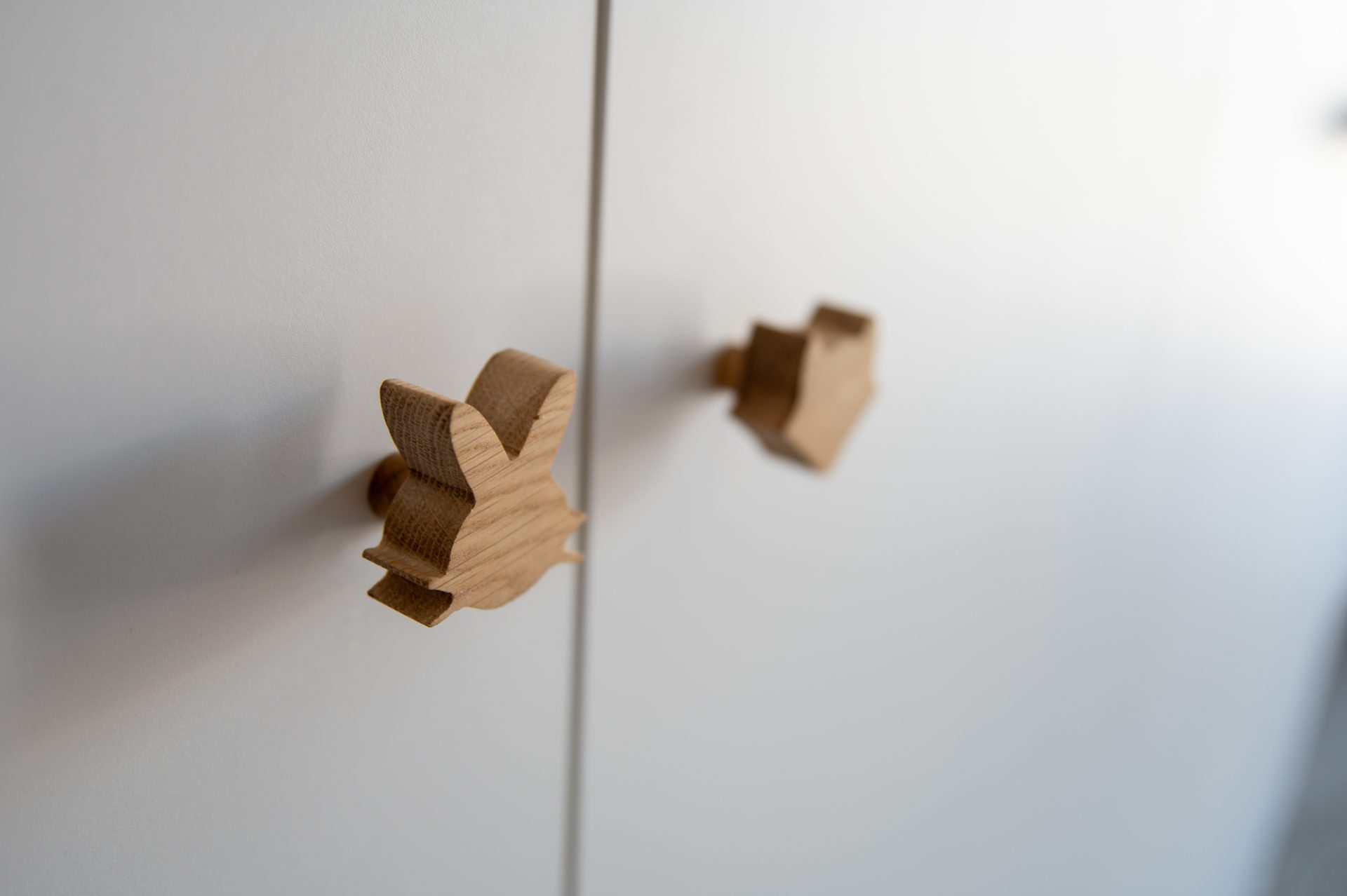 Pokój dziecięcy utrzymany jest w lekkiej, stonowanej kolorystyce – fronty szafy w bieli porcelanowej (Swiss Krono U570 VL) oraz biurko i szafki w odcieniu kaszmiru (Egger U702 ST9 Kaszmir), które tworzą przyjazne miejsce do nauki i zabawy.