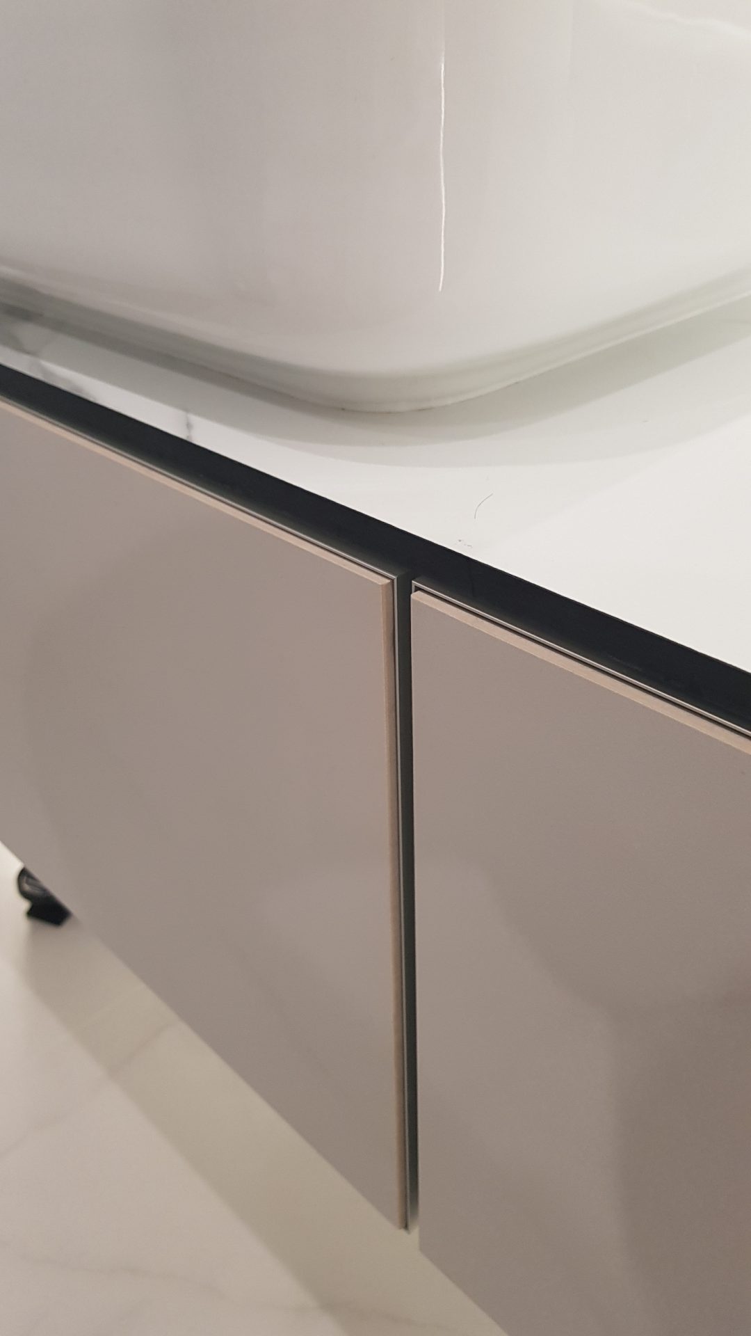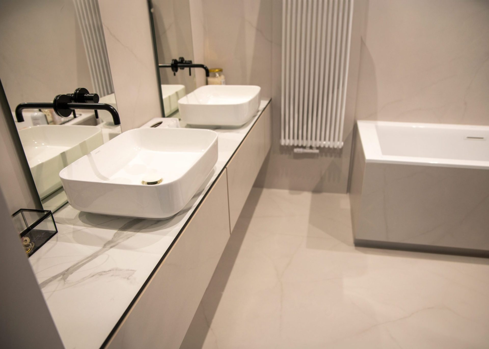 W pierwszej łazience połączyliśmy funkcjonalność z nowoczesnym designem – fronty szafki nad geberitem to biała płyta laminowana (Kronospan U8685 SM Biała Alaska) z naklejaną płytką gresową. Szafka pod umywalką ma fronty w aluminiowych ramach (Zobal Z11 biała) z wklejaną płytką gresową, co zapewnia wysoką trwałość. Dodatkowy akcent stanowi blat o eleganckim wyglądzie marmuru (GetaLit 3493 Marmo Olimpo).