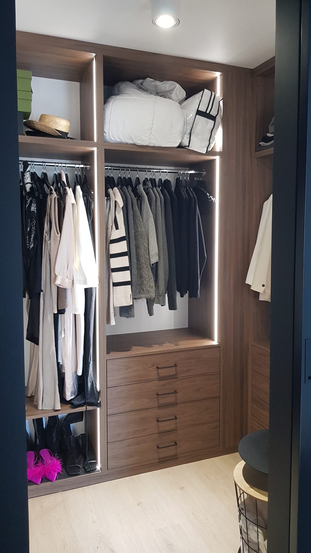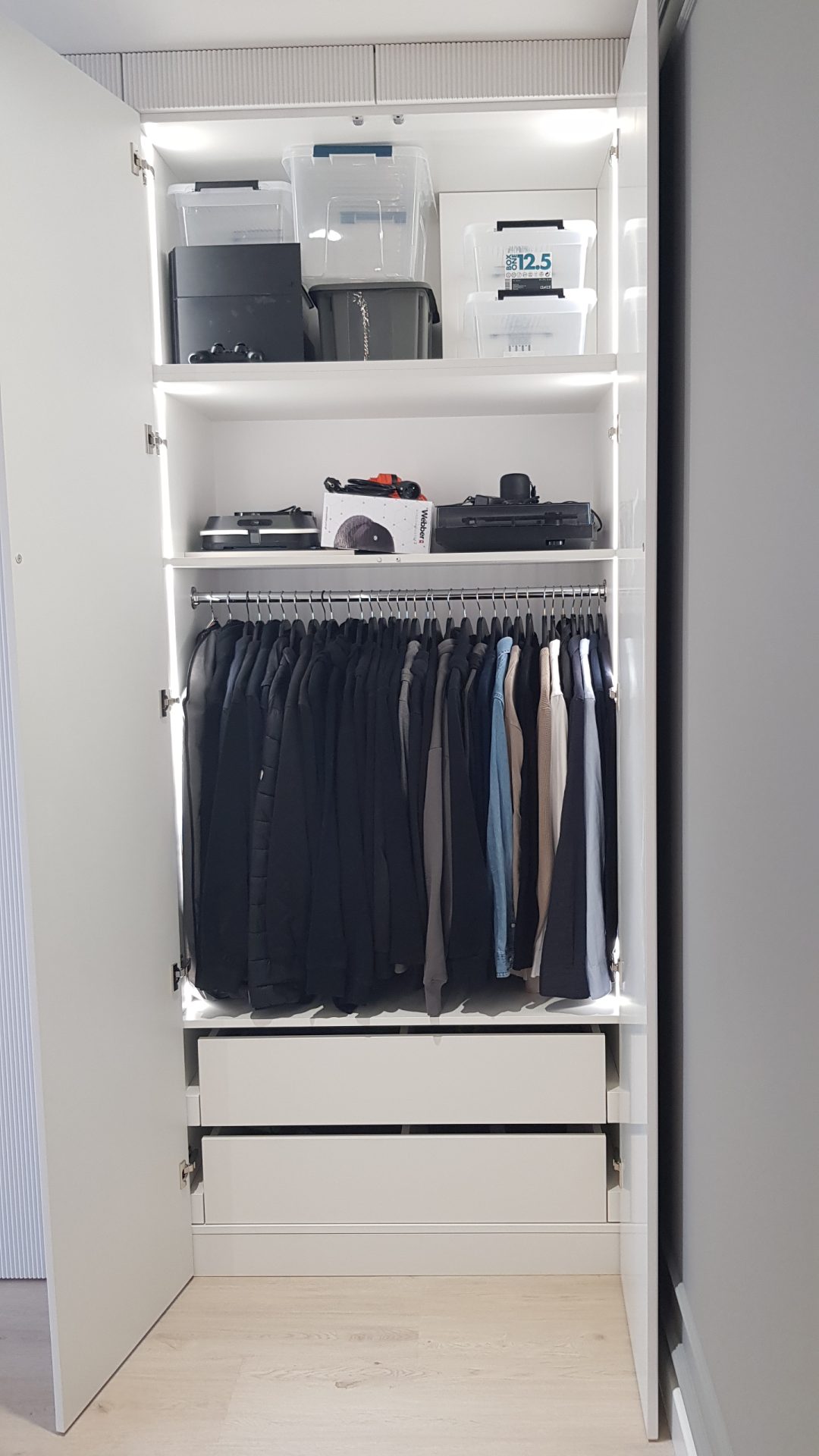 Garderoba została wykonana w całości z laminatu w ciepłym odcieniu orzecha (Egger H3710 ST12 Orzech Carini), co wprowadza do wnętrza przytulność i estetykę. Przemyślany układ zapewnia wygodę użytkowania i idealne zorganizowanie przestrzeni.
