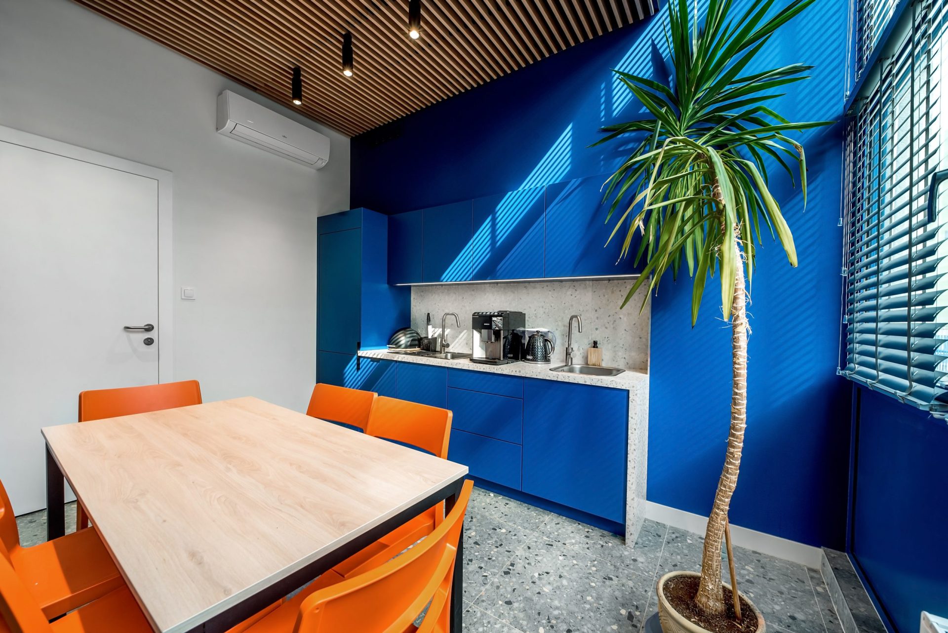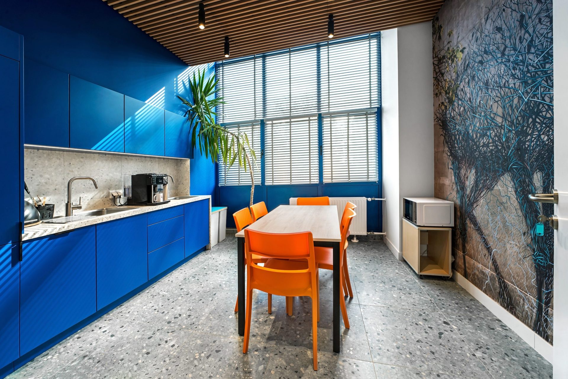 Zabudowa kuchenna zaprojektowana specjalnie dla Radia ESKA to połączenie minimalistycznego designu i wyjątkowego wyczucia kolorystyki. Głębokie, niebieskie fronty szafek kontrastują z blatem wykonanym z wytrzymałego blatu o naturalnym, kamiennym wykończeniu. Przemyślana organizacja przestrzeni zapewnia komfort użytkowania, dzięki ukrytym systemom przechowywania i wbudowanemu sprzętowi AGD. Uzupełnieniem są detale, takie jak zintegrowane uchwyty i subtelne oświetlenie, które podkreśla nowoczesny charakter wnętrza.