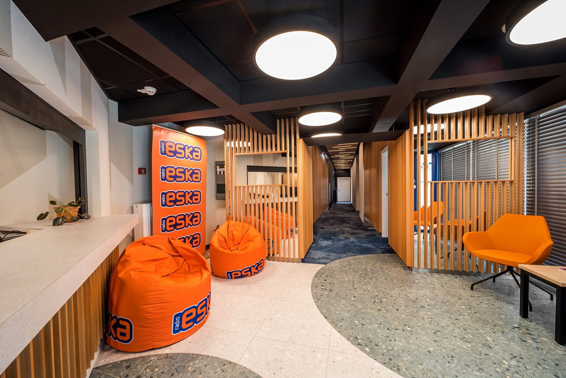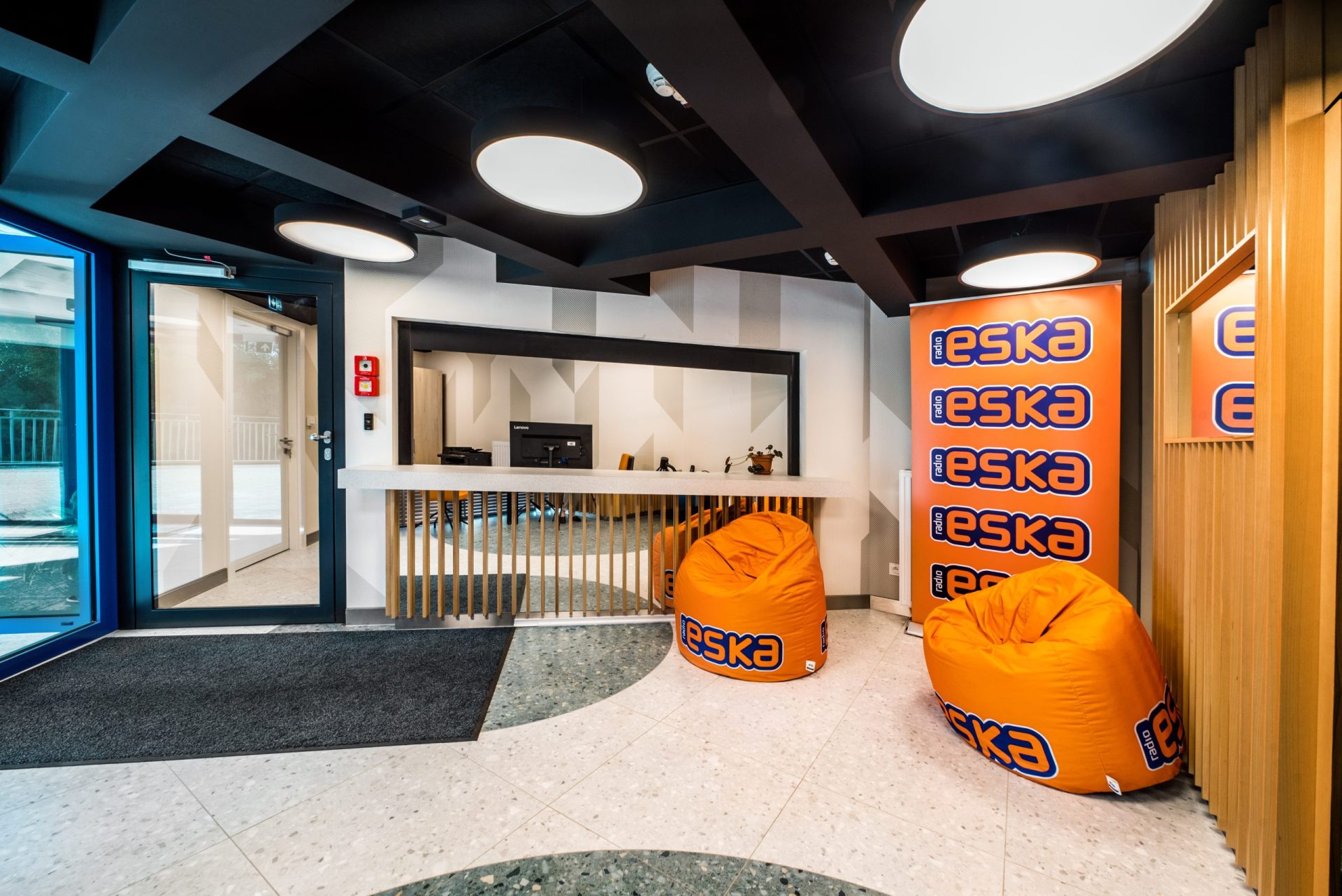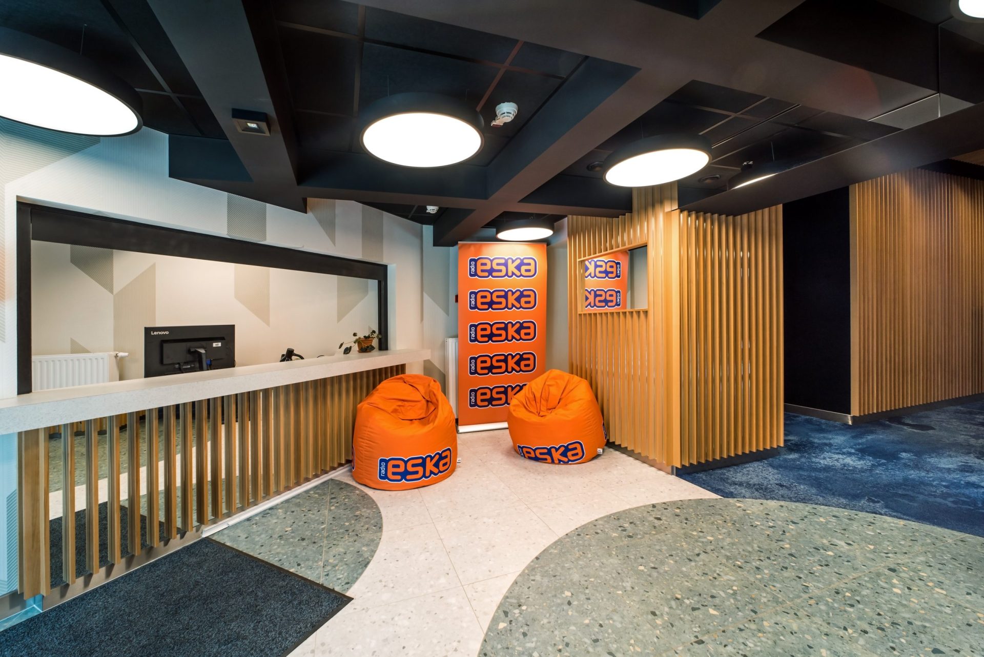 Główne lobby Radia ESKA to przestrzeń, która już od progu robi wrażenie. Zabudowy w postaci pionowych lameli tworzą nowoczesną strukturę, która nadaje wnętrzu lekkości, a jednocześnie wydziela poszczególne strefy. Użycie bukowego forniru ociepla przestrzeń, a także podkreślają unikalny charakter marki. Całość została zintegrowana z industrialnym sufitem i nowoczesnym oświetleniem, które doskonale dopełniają projekt.