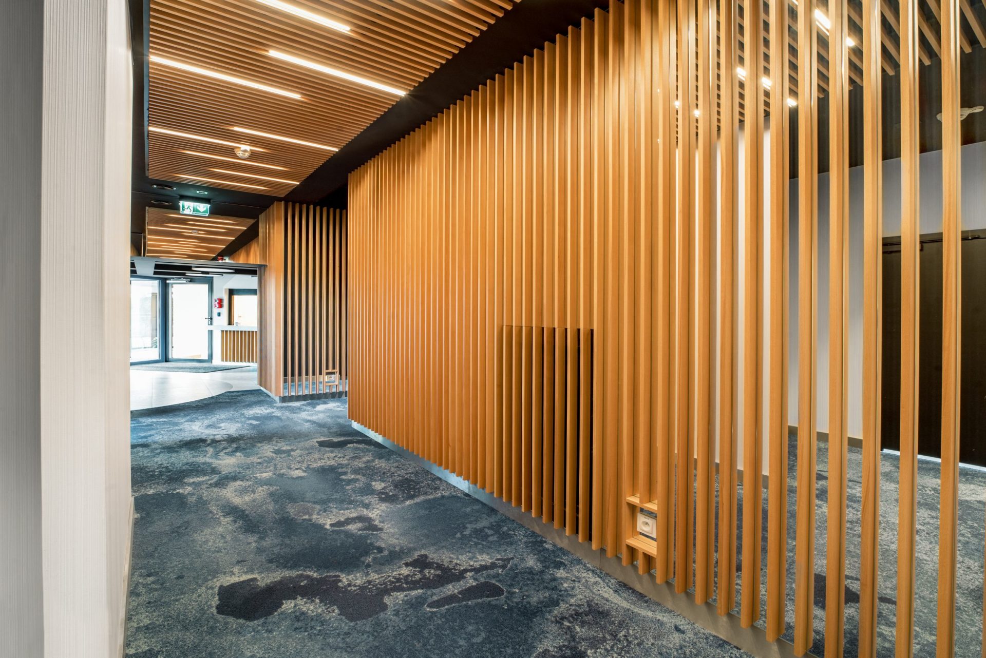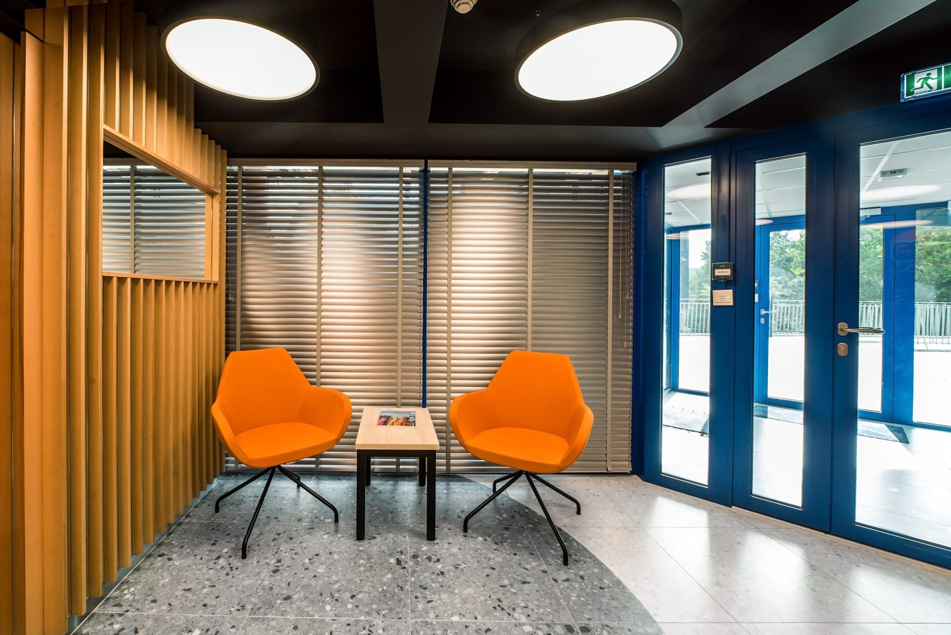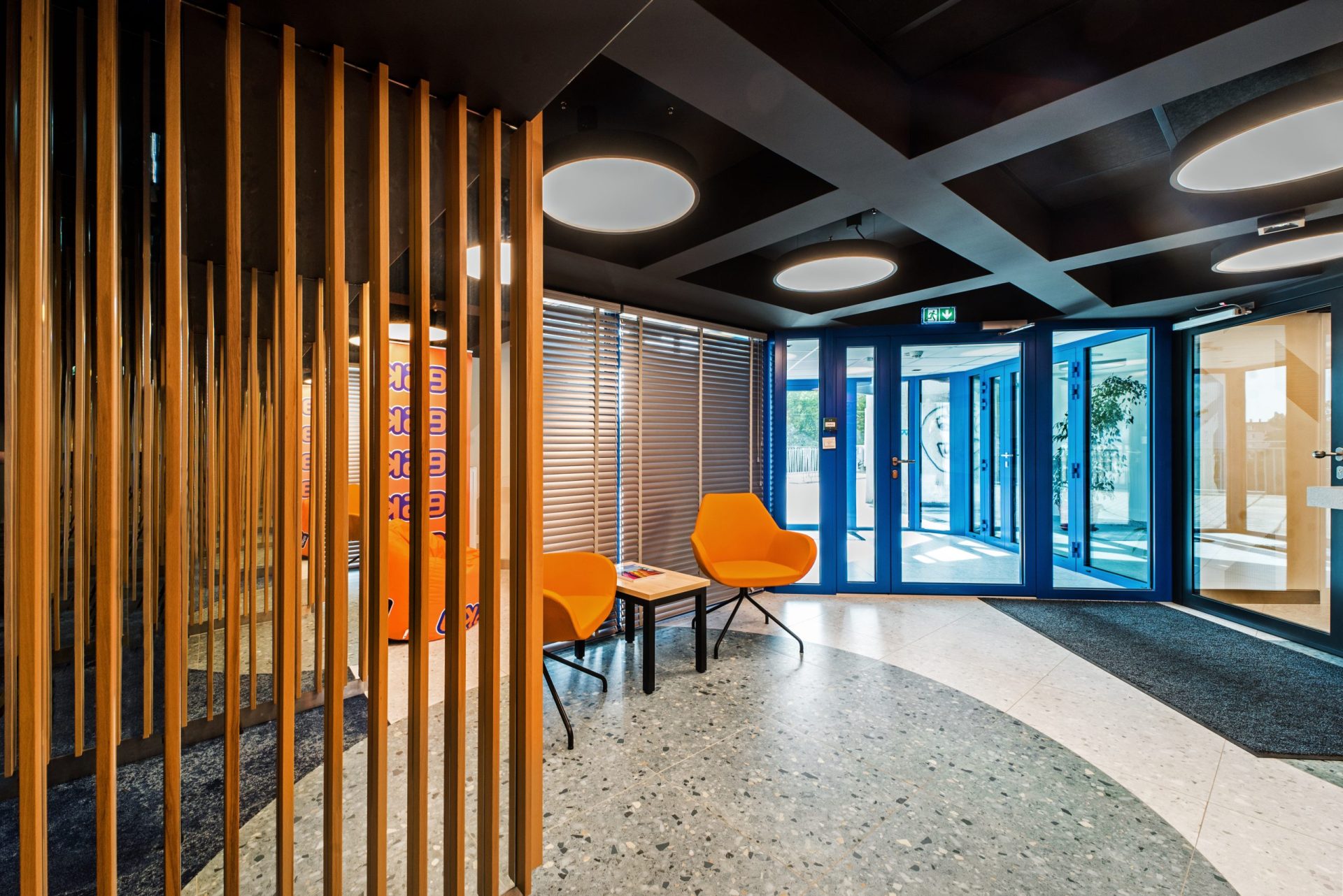 Główne lobby Radia ESKA to przestrzeń, która już od progu robi wrażenie. Zabudowy w postaci pionowych lameli tworzą nowoczesną strukturę, która nadaje wnętrzu lekkości, a jednocześnie wydziela poszczególne strefy. Użycie bukowego forniru ociepla przestrzeń, a także podkreślają unikalny charakter marki. Całość została zintegrowana z industrialnym sufitem i nowoczesnym oświetleniem, które doskonale dopełniają projekt.