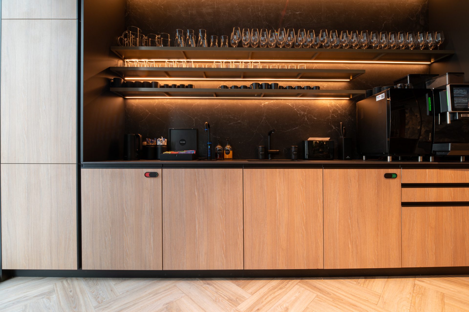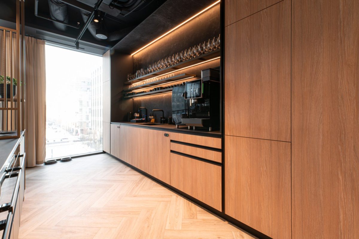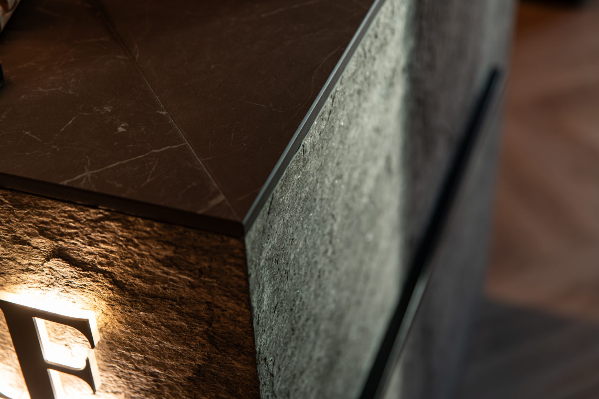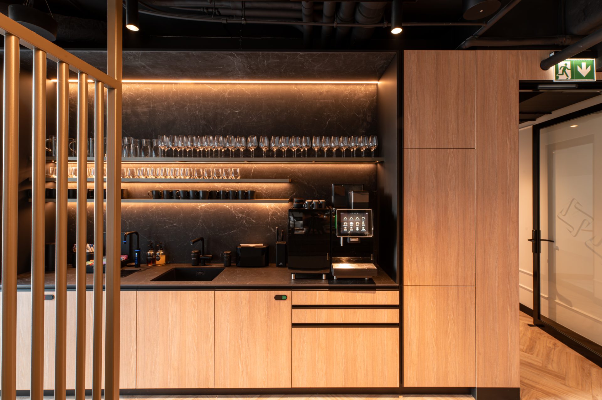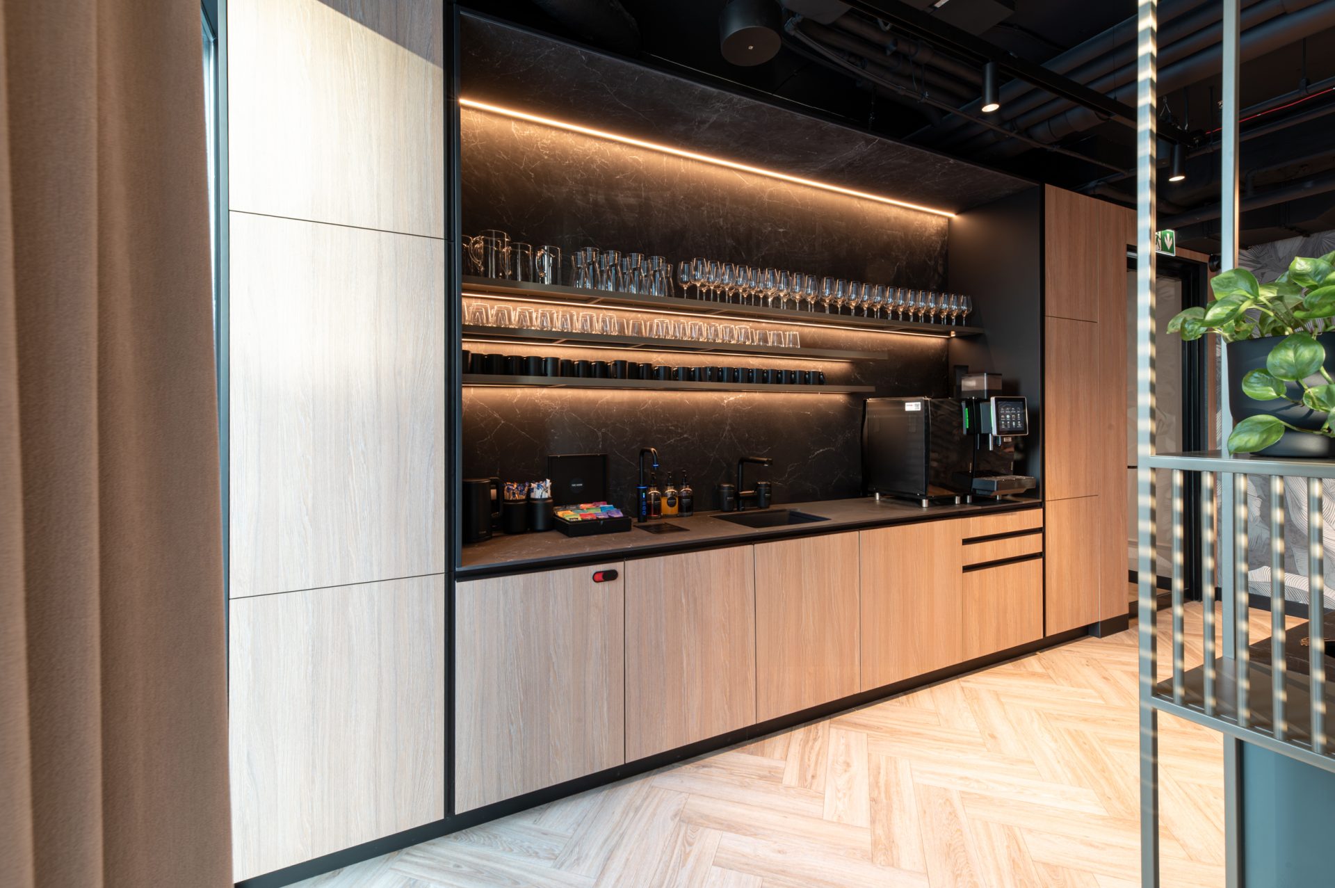 Istotnym elementem realizacji był świadomy dobór materiałów, które podkreślają prestiżowy charakter wnętrza, a jednocześnie gwarantują trwałość w intensywnie użytkowanej przestrzeni biurowej. W zabudowach meblowych zastosowano wysokiej jakości płyty laminowane Kronospan i Egger, zestawione kolorystycznie z głęboką czernią oraz wyrazistymi dekorami inspirowanymi naturalnymi materiałami. Kluczowe powierzchnie robocze i reprezentacyjne wykończono spiekami kwarcowymi Laminam Nero Greco, które nadają wnętrzu elegancji i monolitycznego charakteru. Całość dopełnia fornir kamienny, użyty m.in. w recepcji, stanowiący mocny, rozpoznawalny akcent wizualny oraz podkreślający rzemieślniczy, „craftowy” wymiar projektu. Uzupełnieniem zabudów są czarne elementy wyposażenia, armatura oraz detale, które wzmacniają industrialny charakter przestrzeni i spajają ją w spójną, nowoczesną całość.