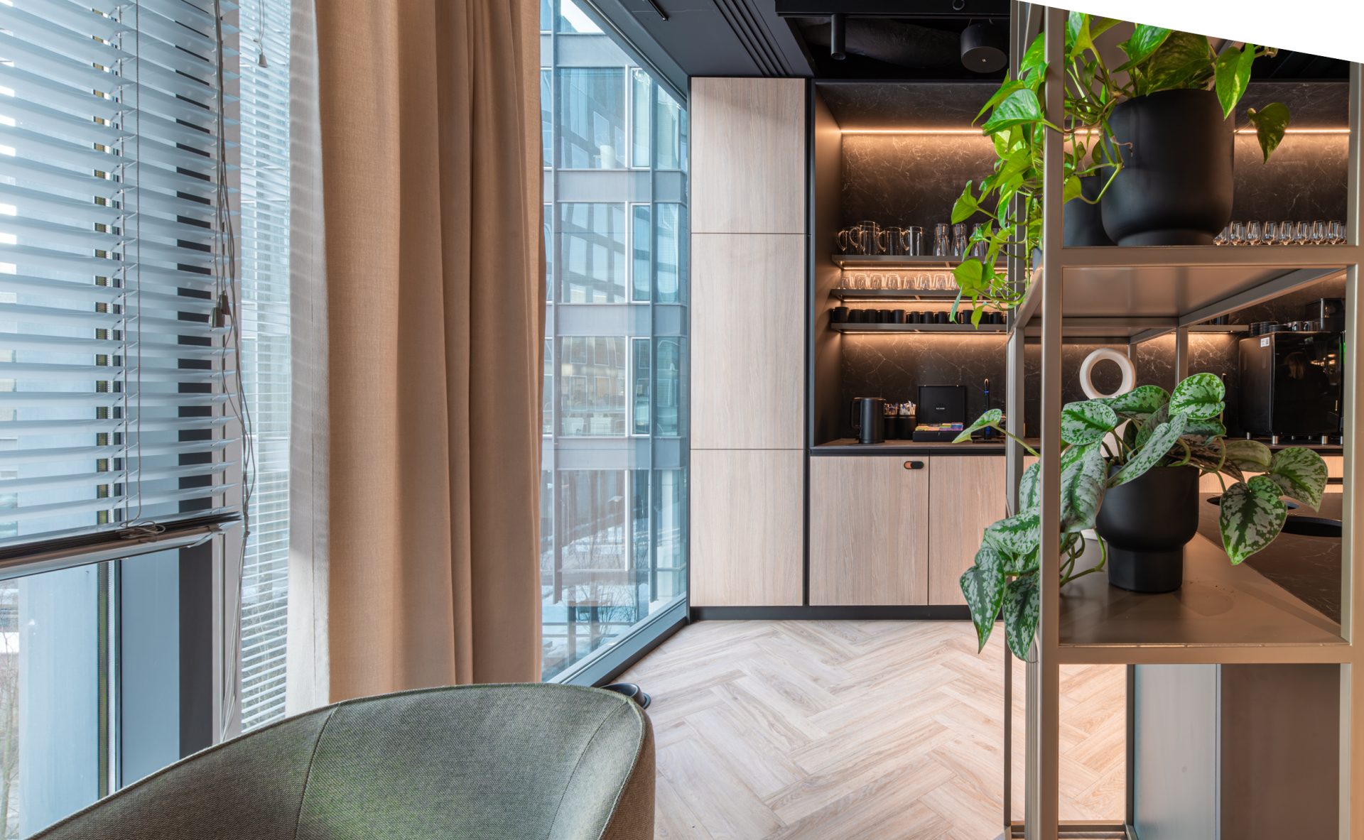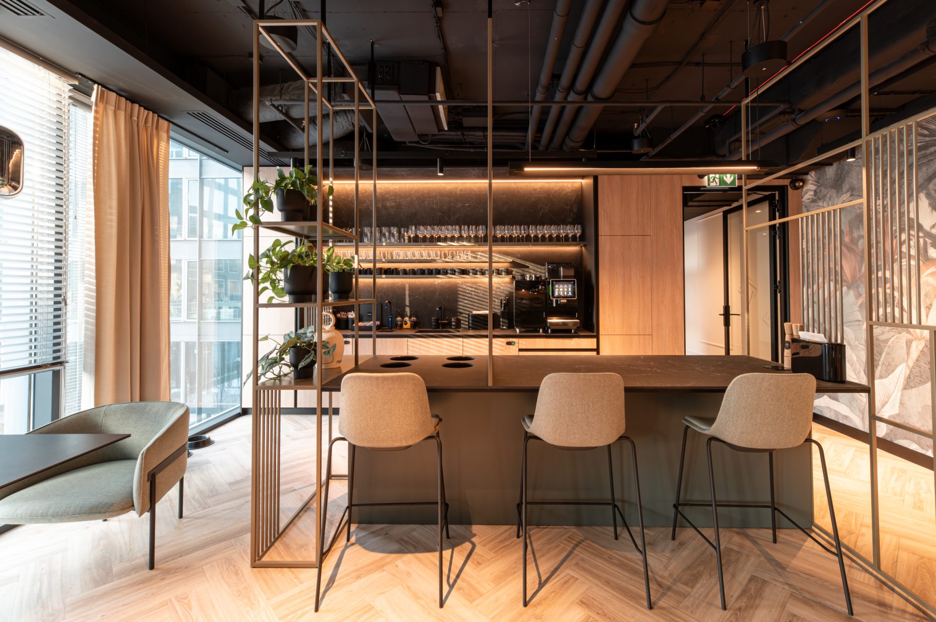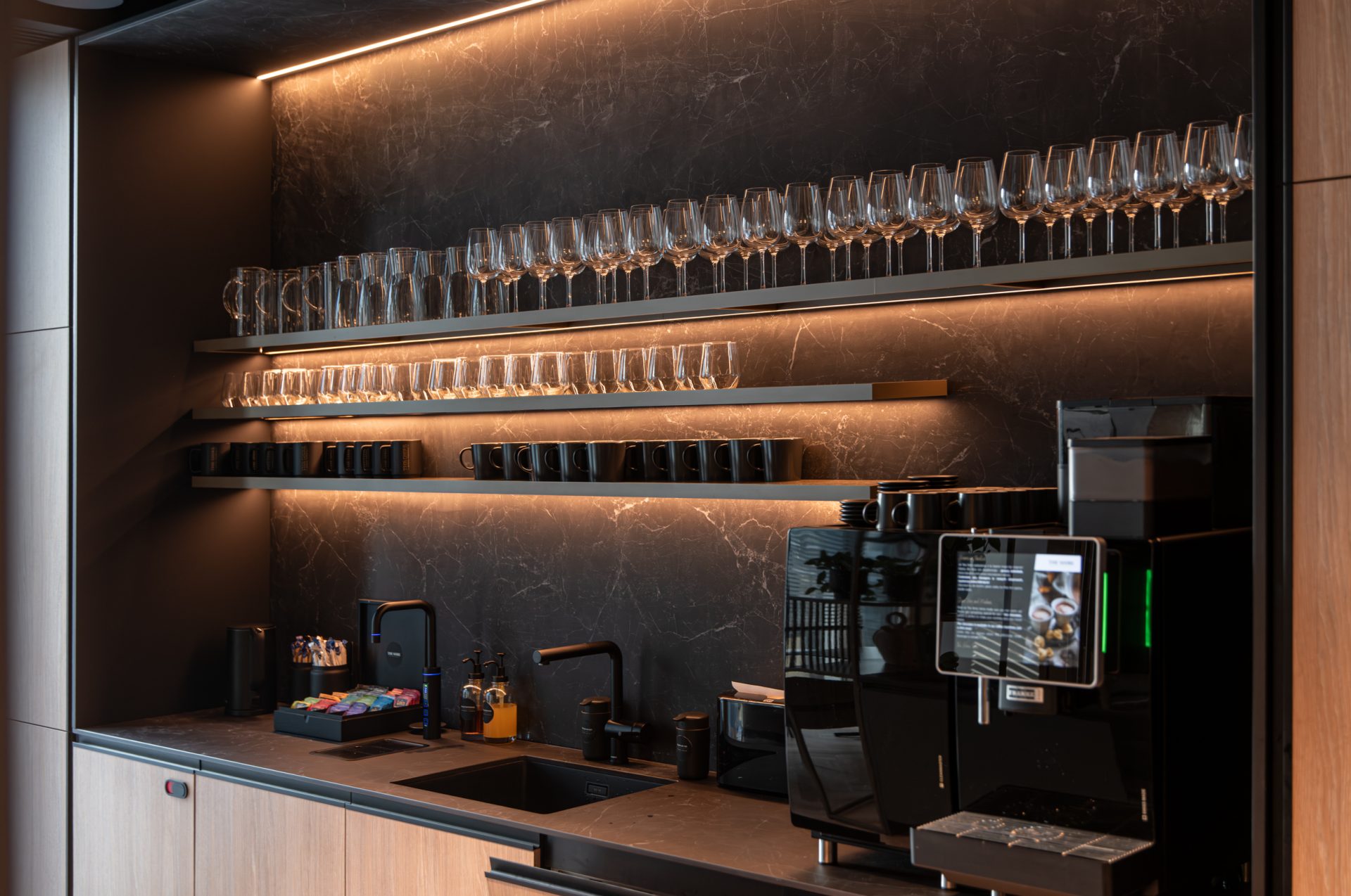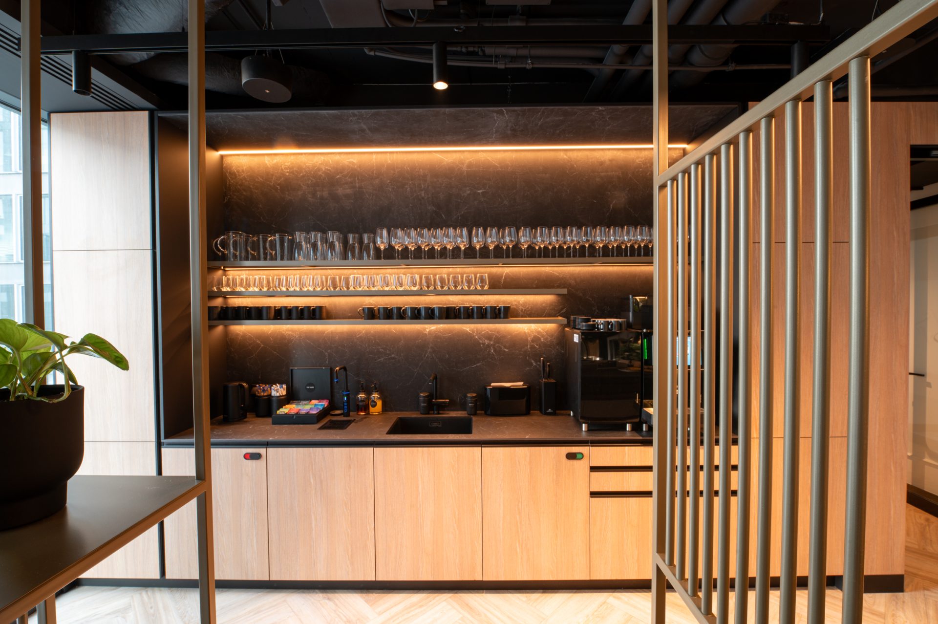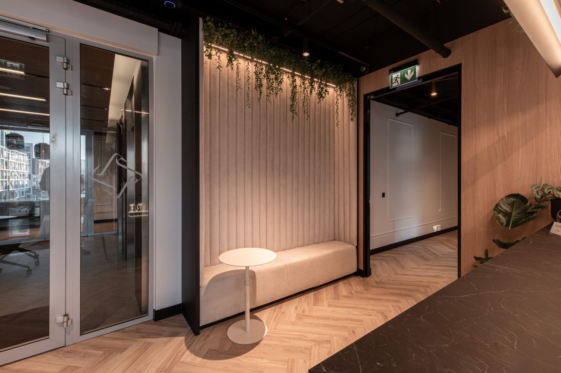 Istotnym elementem realizacji był świadomy dobór materiałów, które podkreślają prestiżowy charakter wnętrza, a jednocześnie gwarantują trwałość w intensywnie użytkowanej przestrzeni biurowej. W zabudowach meblowych zastosowano wysokiej jakości płyty laminowane Kronospan i Egger, zestawione kolorystycznie z głęboką czernią oraz wyrazistymi dekorami inspirowanymi naturalnymi materiałami. Kluczowe powierzchnie robocze i reprezentacyjne wykończono spiekami kwarcowymi Laminam Nero Greco, które nadają wnętrzu elegancji i monolitycznego charakteru. Całość dopełnia fornir kamienny, użyty m.in. w recepcji, stanowiący mocny, rozpoznawalny akcent wizualny oraz podkreślający rzemieślniczy, „craftowy” wymiar projektu. Uzupełnieniem zabudów są czarne elementy wyposażenia, armatura oraz detale, które wzmacniają industrialny charakter przestrzeni i spajają ją w spójną, nowoczesną całość.