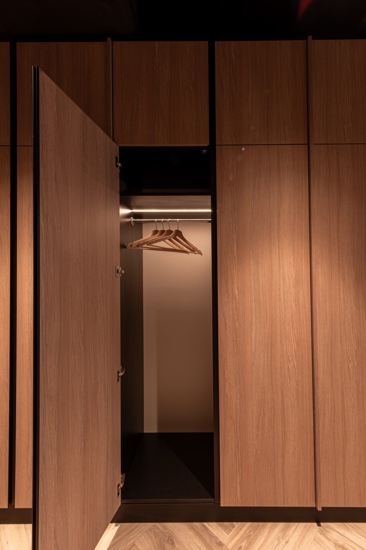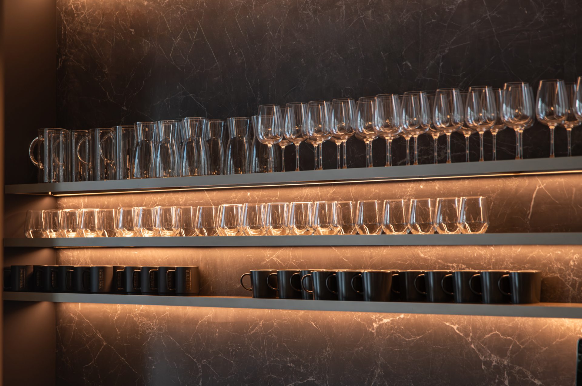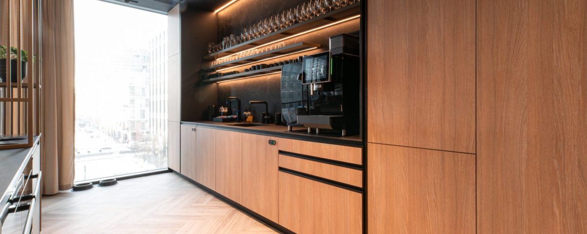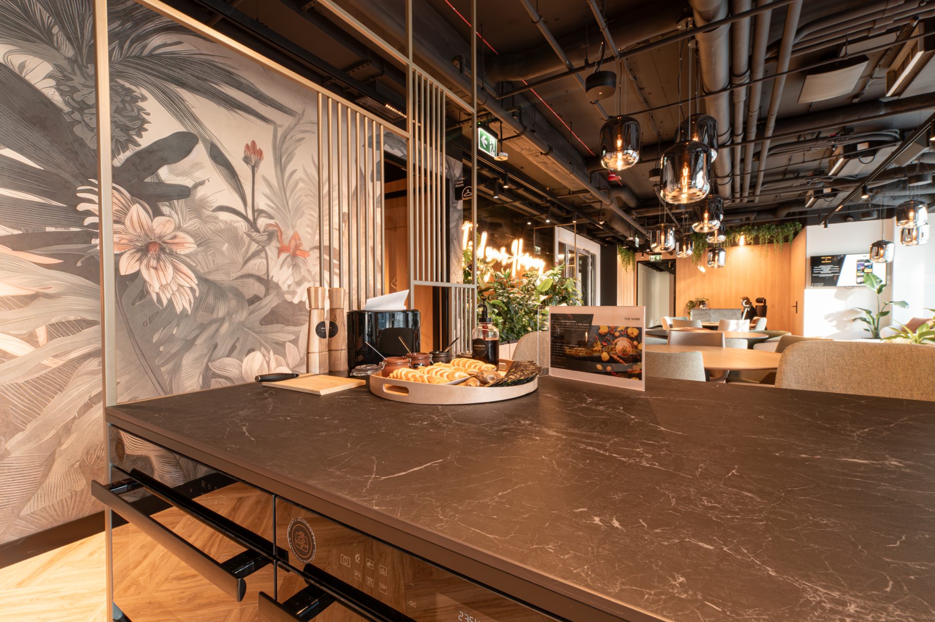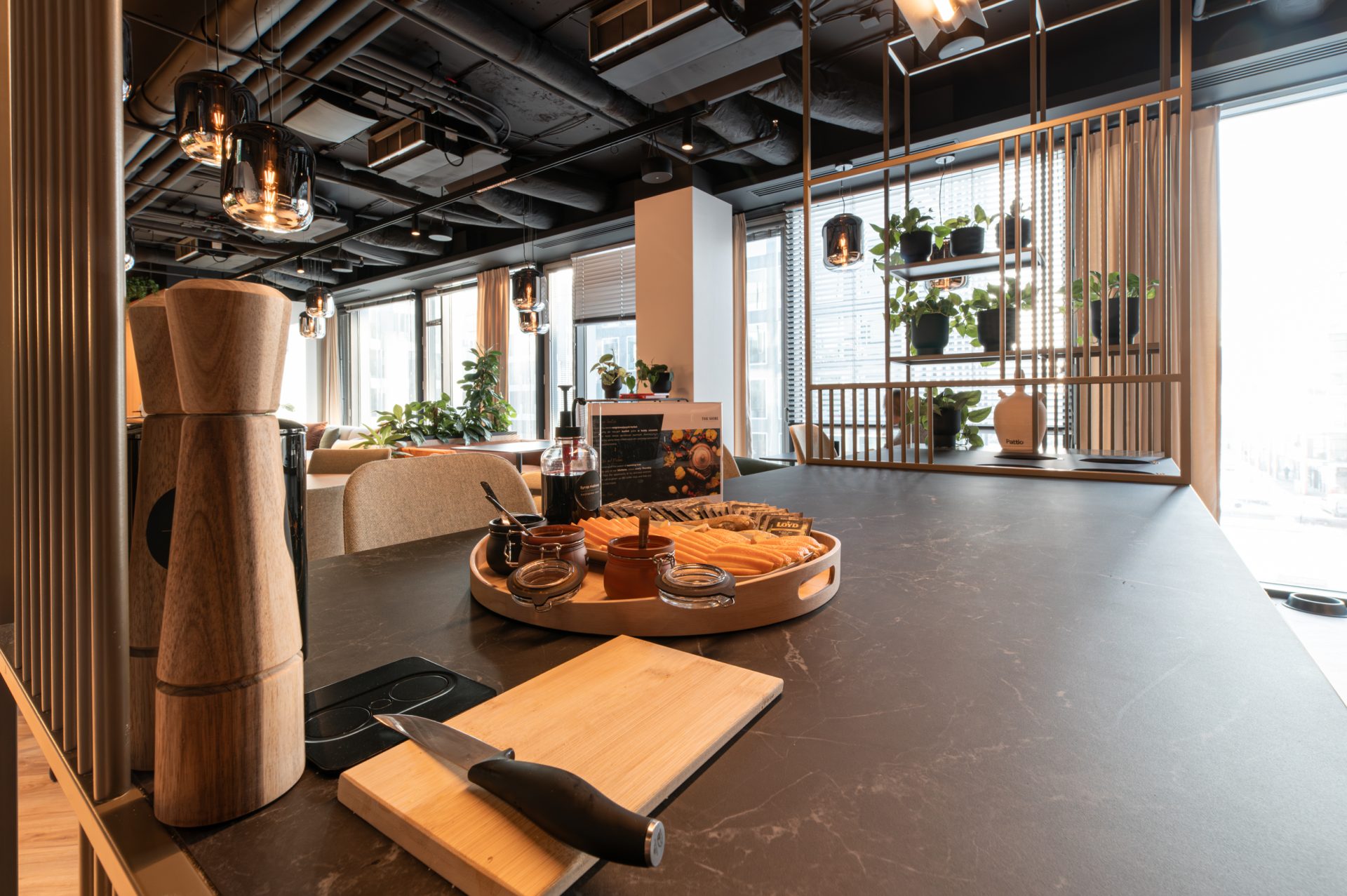 Istotnym elementem realizacji był świadomy dobór materiałów, które podkreślają prestiżowy charakter wnętrza, a jednocześnie gwarantują trwałość w intensywnie użytkowanej przestrzeni biurowej. W zabudowach meblowych zastosowano wysokiej jakości płyty laminowane Kronospan i Egger, zestawione kolorystycznie z głęboką czernią oraz wyrazistymi dekorami inspirowanymi naturalnymi materiałami. Kluczowe powierzchnie robocze i reprezentacyjne wykończono spiekami kwarcowymi Laminam Nero Greco, które nadają wnętrzu elegancji i monolitycznego charakteru. Całość dopełnia fornir kamienny, użyty m.in. w recepcji, stanowiący mocny, rozpoznawalny akcent wizualny oraz podkreślający rzemieślniczy, „craftowy” wymiar projektu. Uzupełnieniem zabudów są czarne elementy wyposażenia, armatura oraz detale, które wzmacniają industrialny charakter przestrzeni i spajają ją w spójną, nowoczesną całość.