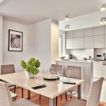 Zwisające lampy nad wyspą oraz listwa reflektorów na suficie zapewniają równomierne i nastrojowe oświetlenie. Całość dopełniają jasne, wielkoformatowe płytki podłogowe i subtelne, gładkie ściany, które tworzą doskonałe tło dla nowoczesnej kuchni.